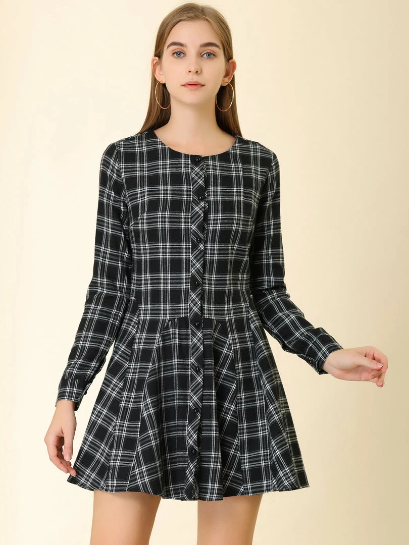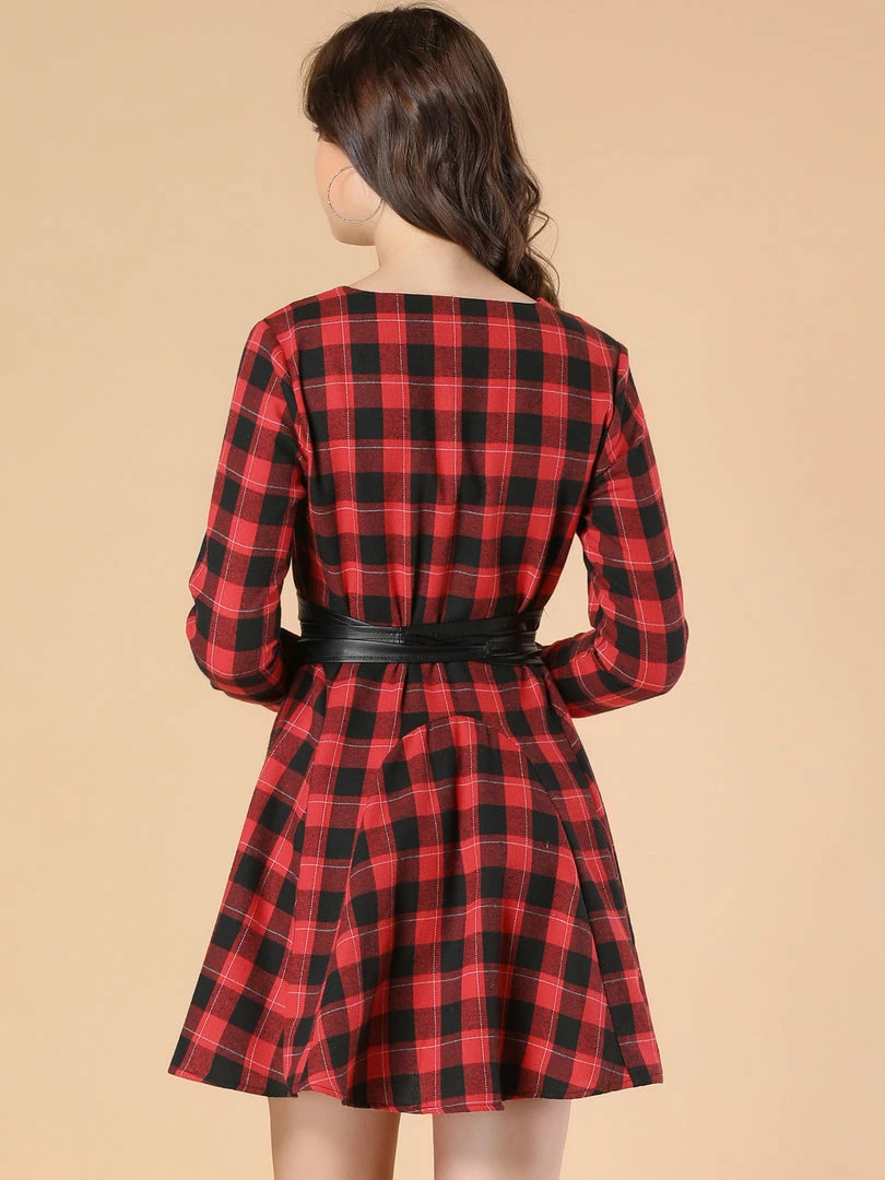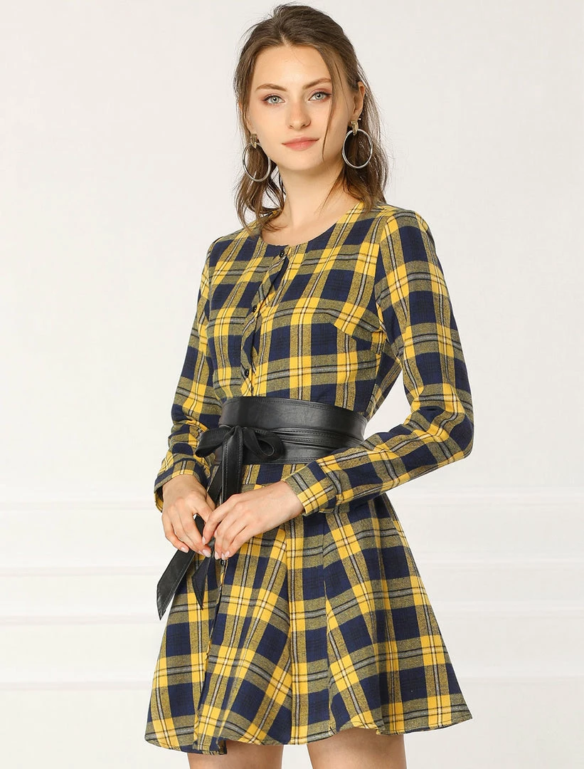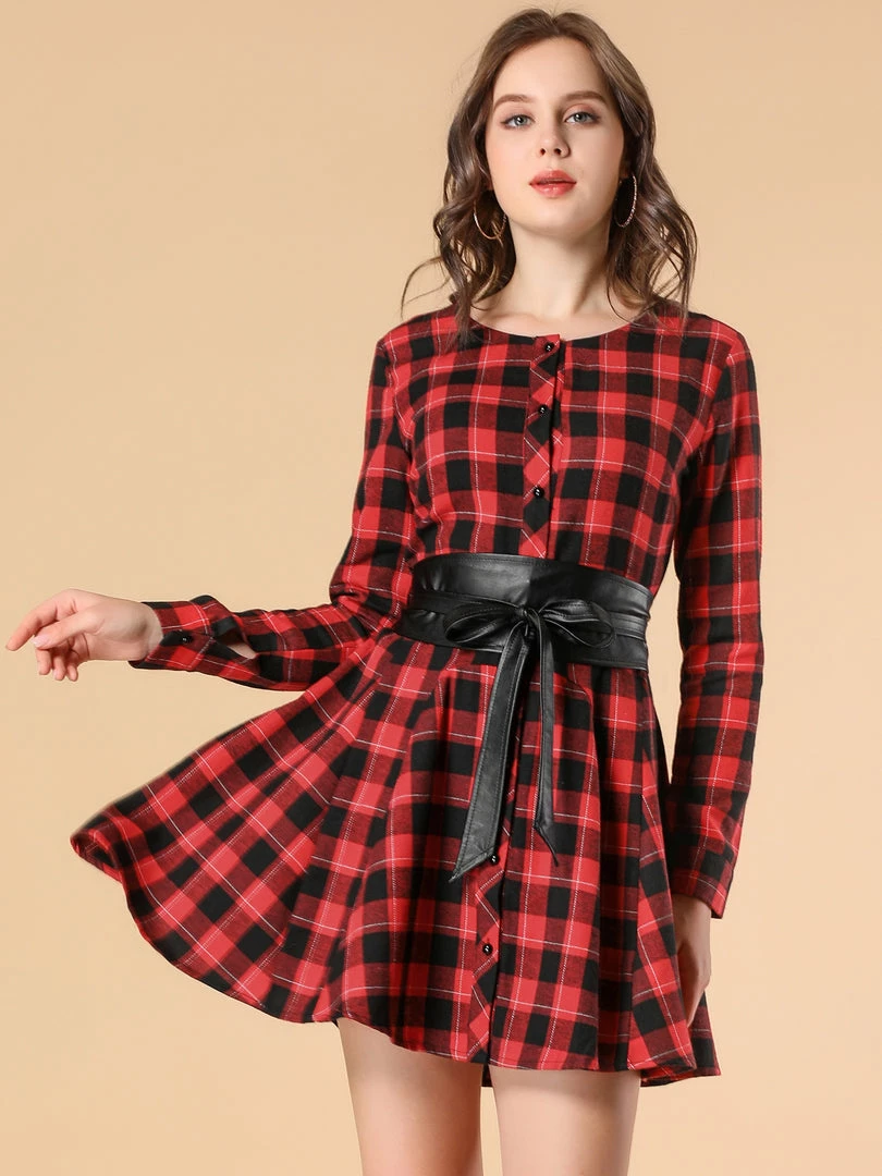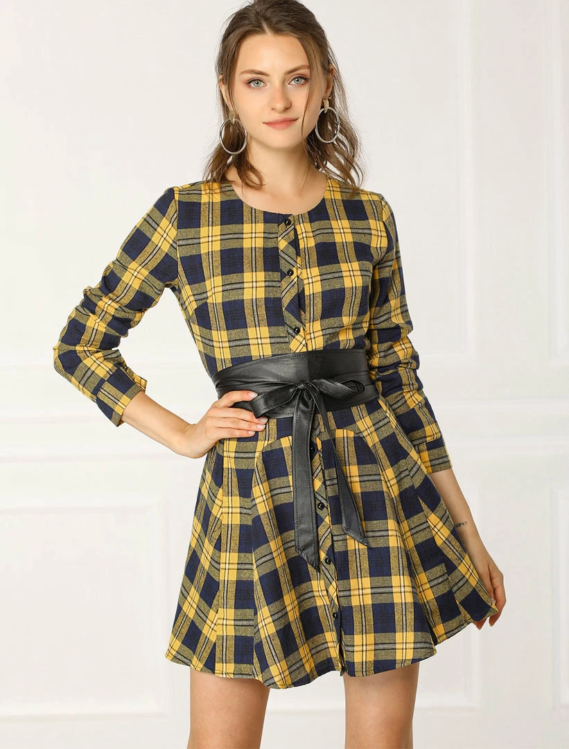 • This mini dress is complete with plaid prints and a round neck. A line sharpens the look, and a tie belt defines the waist.