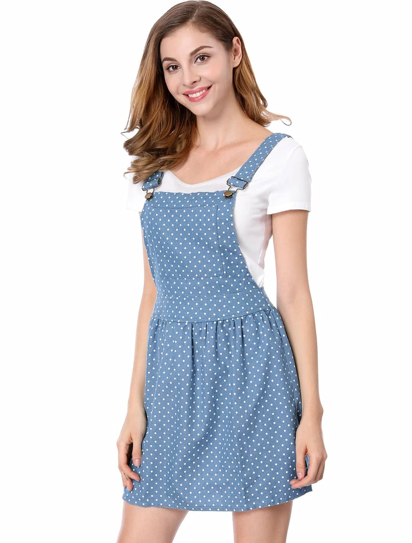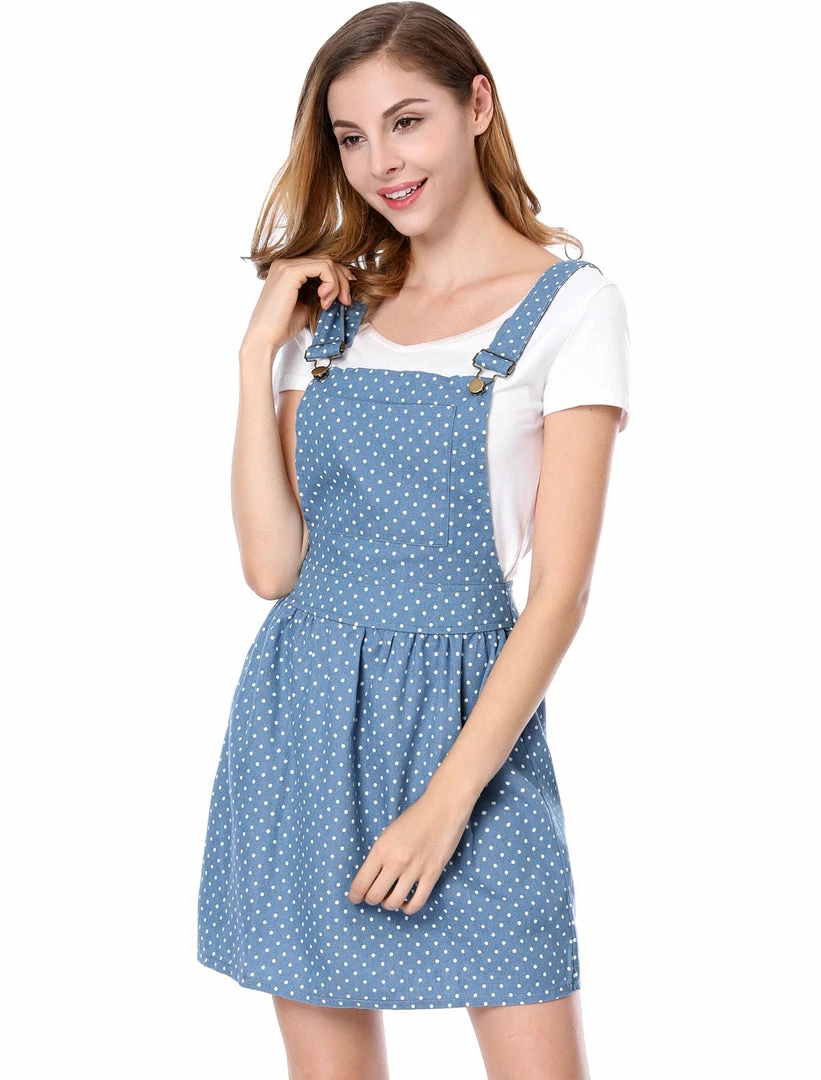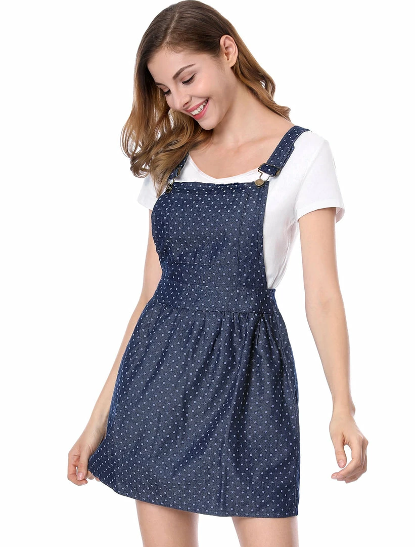 • This overall dress features allover dots print, adjustable shoulder straps, and a front pocket.