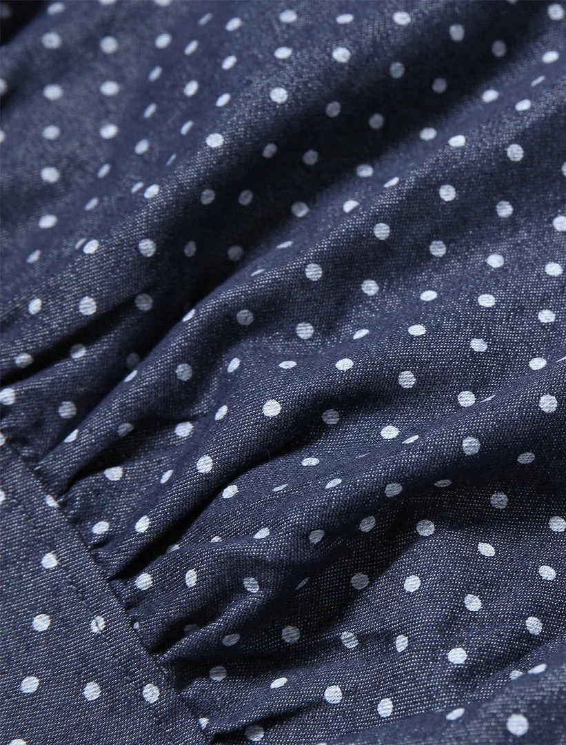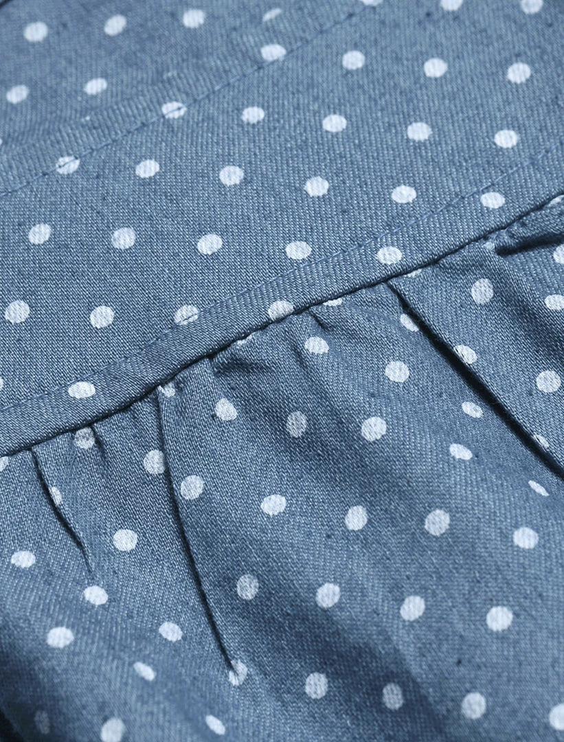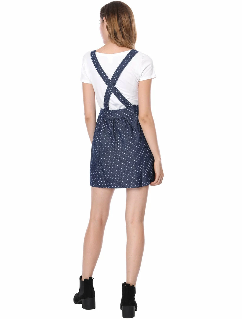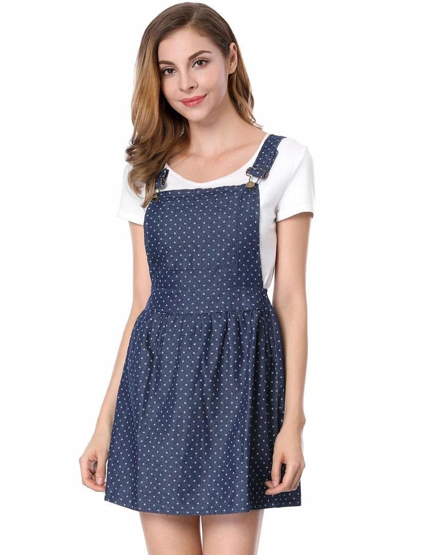 • This overall dress features allover dots print, adjustable shoulder straps, and a front pocket.