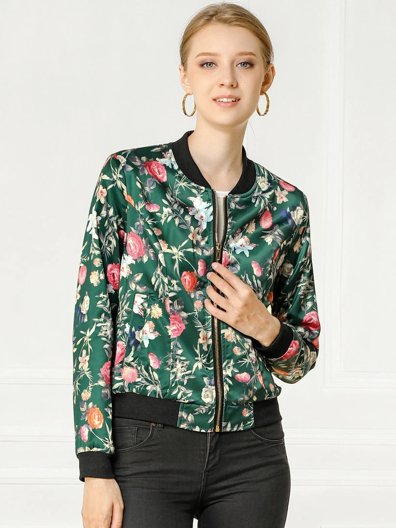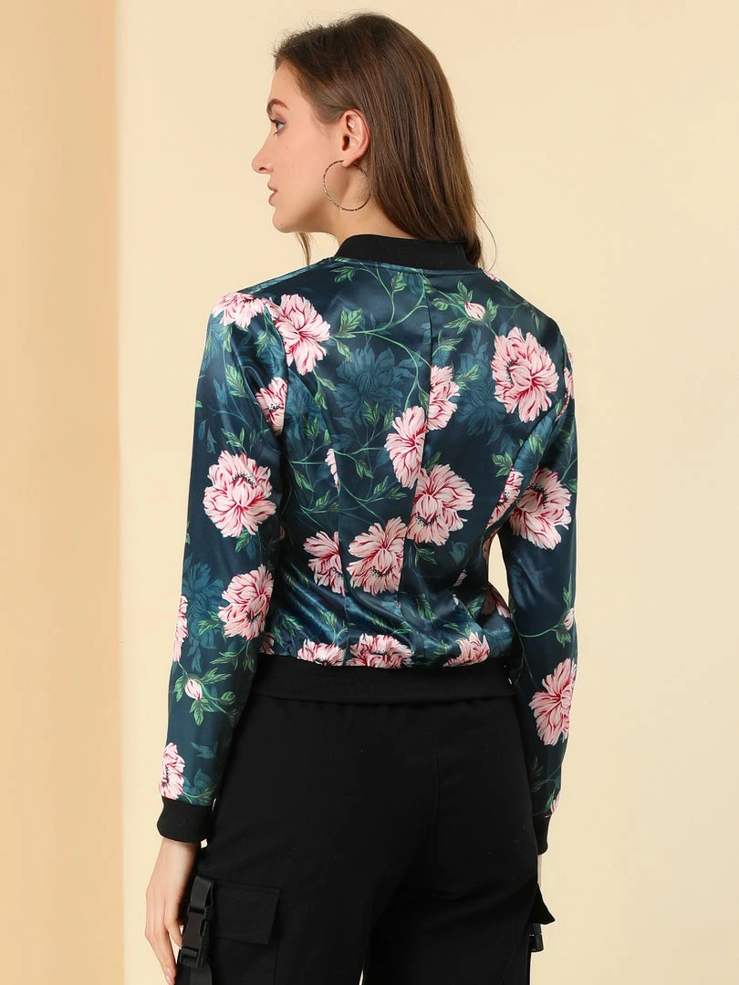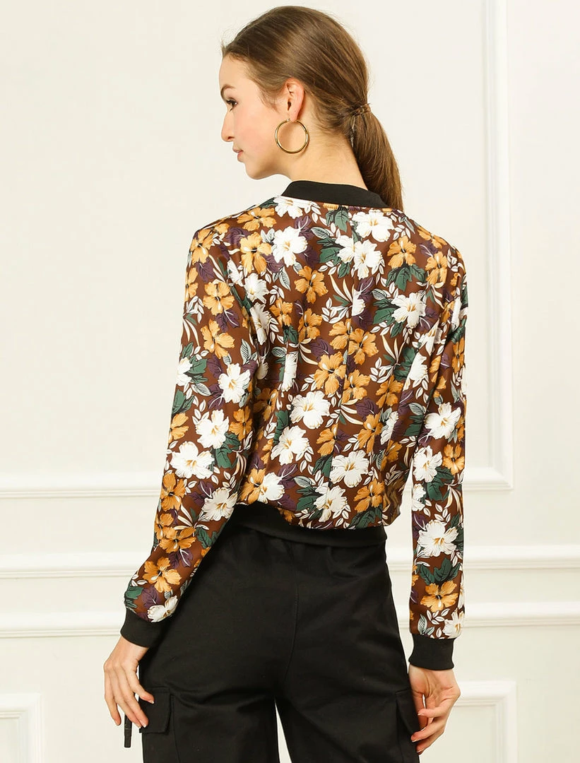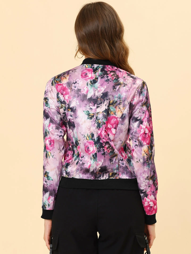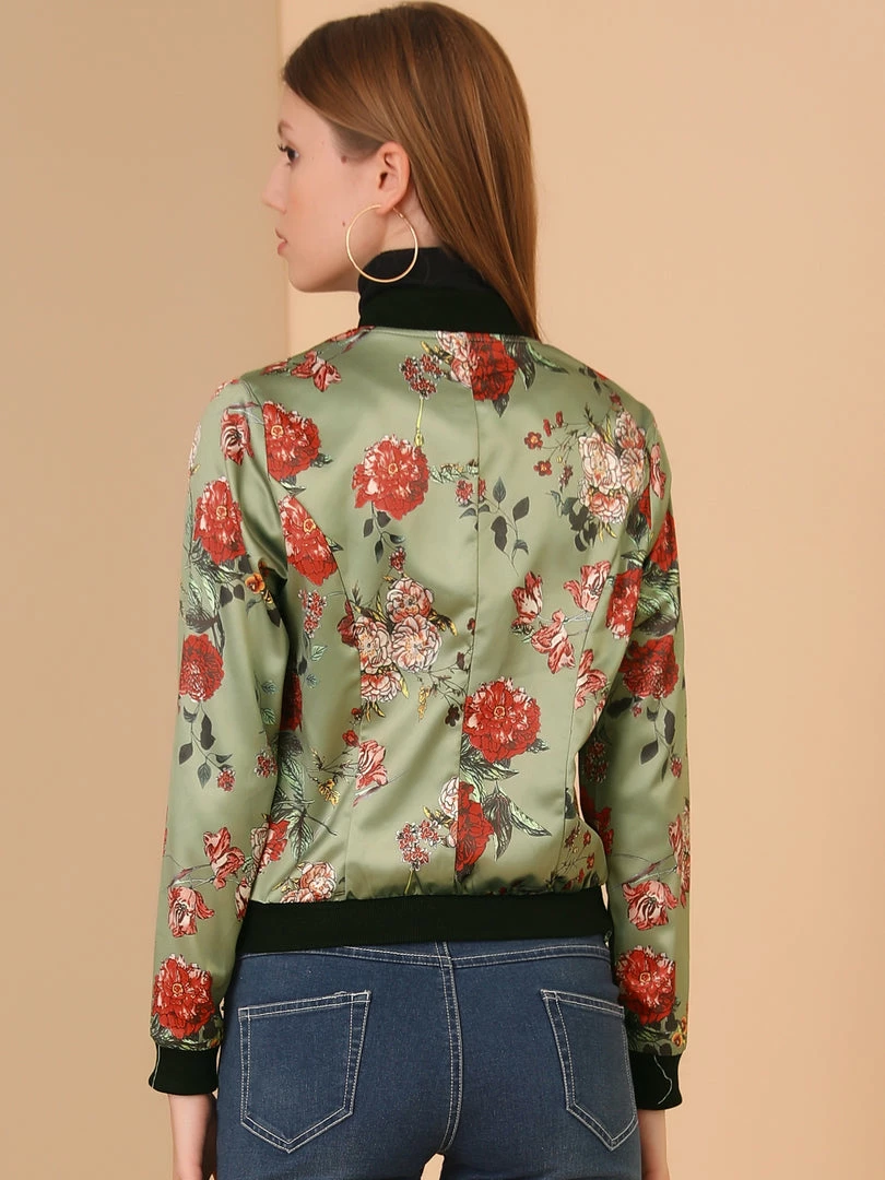 Allegra K 8127 Women Stand Collar Zip Up Floral Prints Bomber Jacket