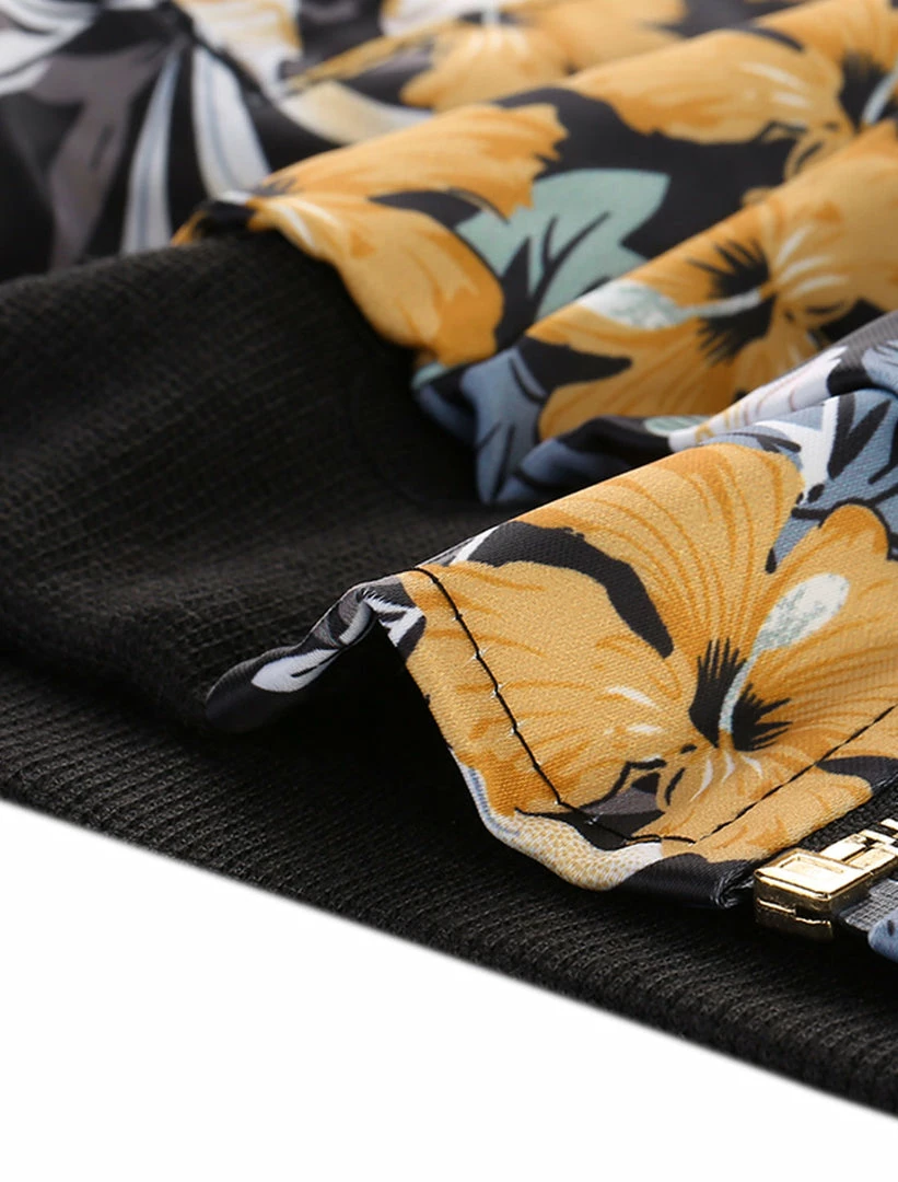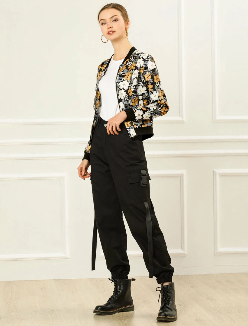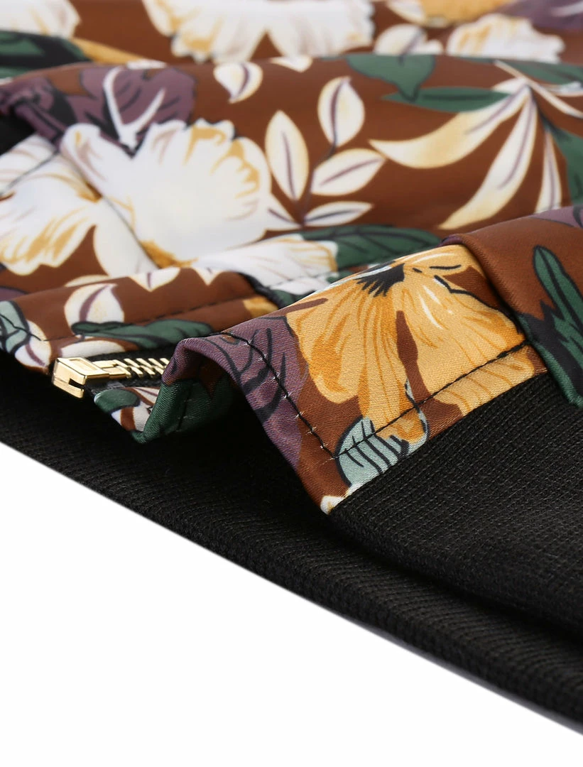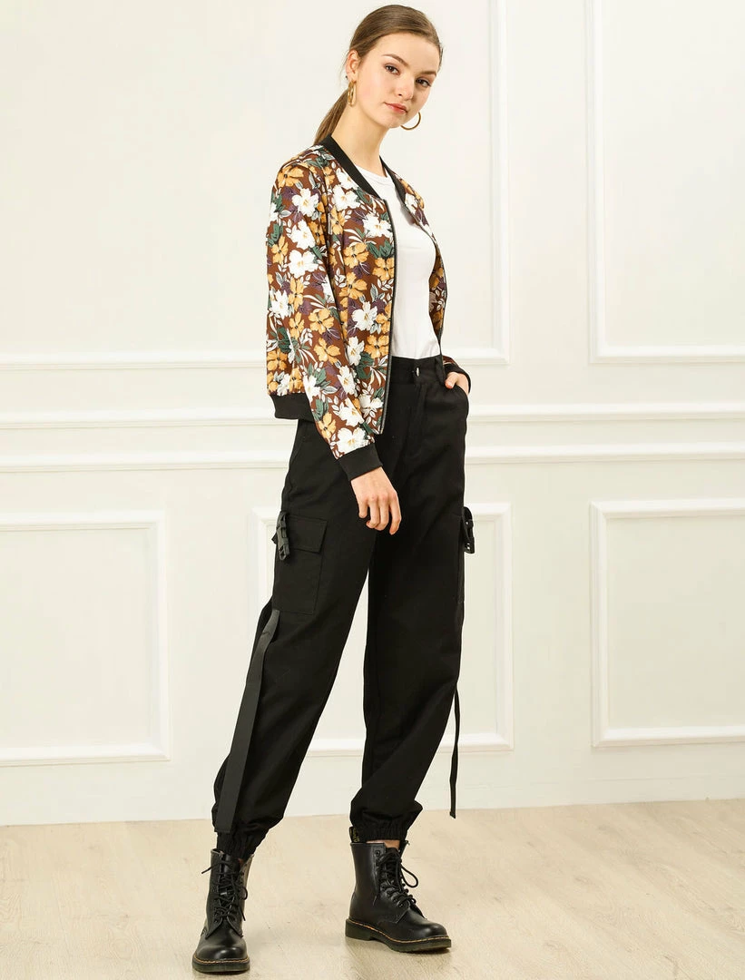 Allegra K 8127 Women Stand Collar Zip Up Floral Prints Bomber Jacket