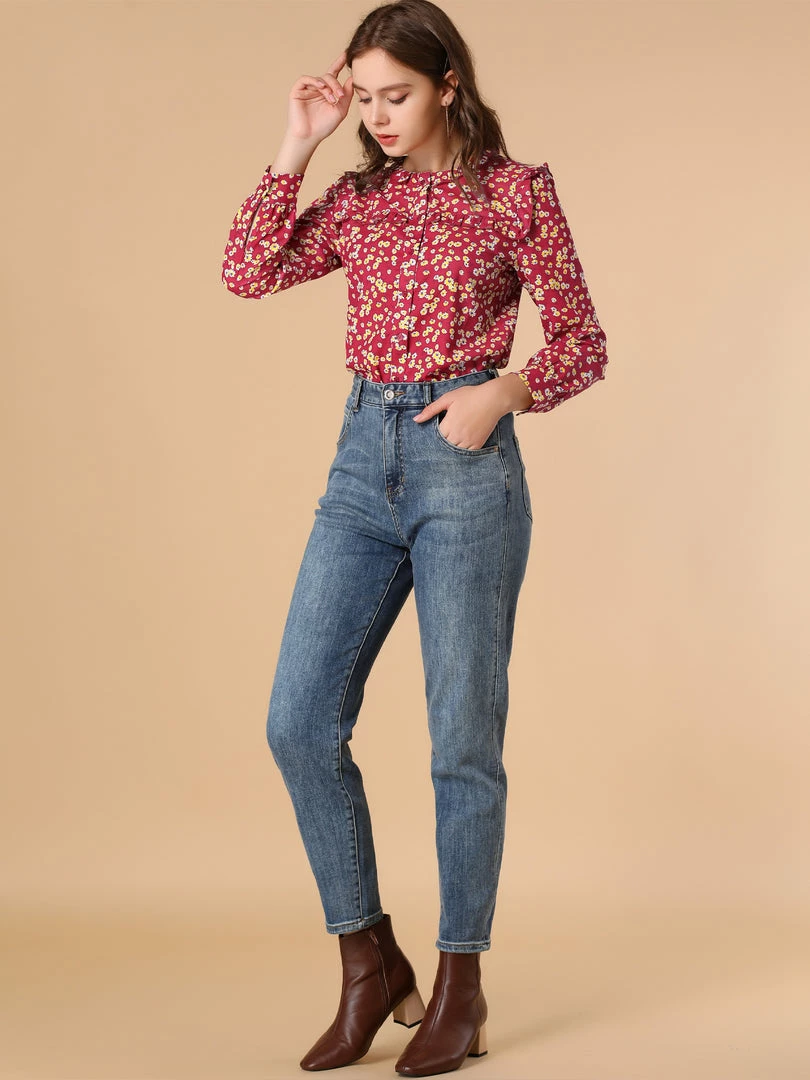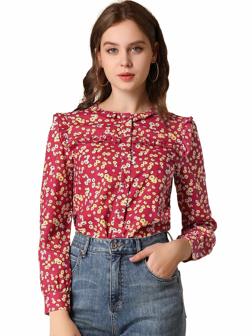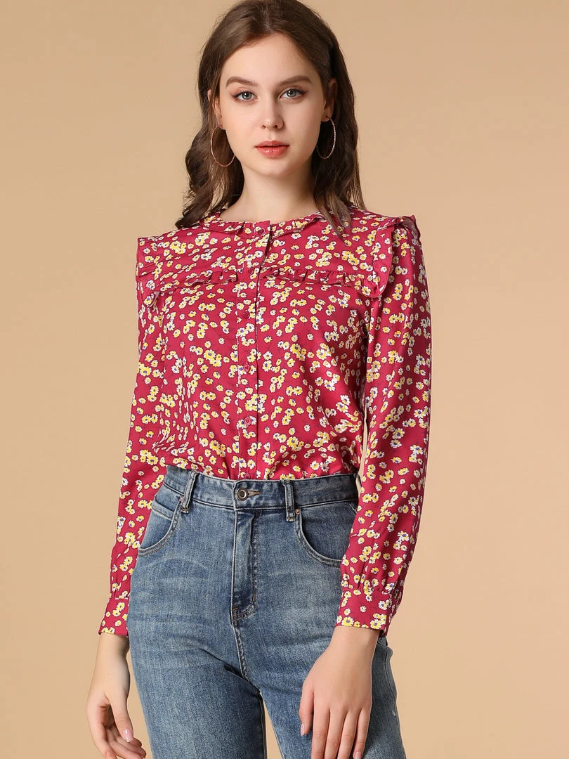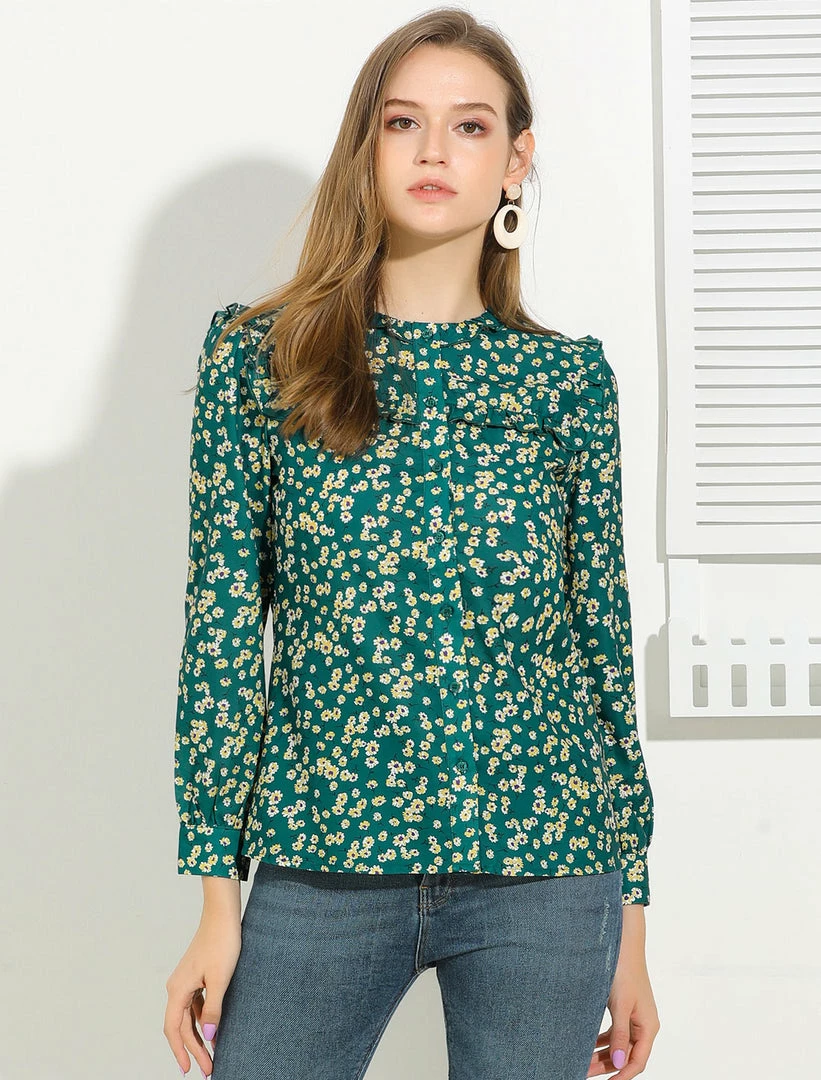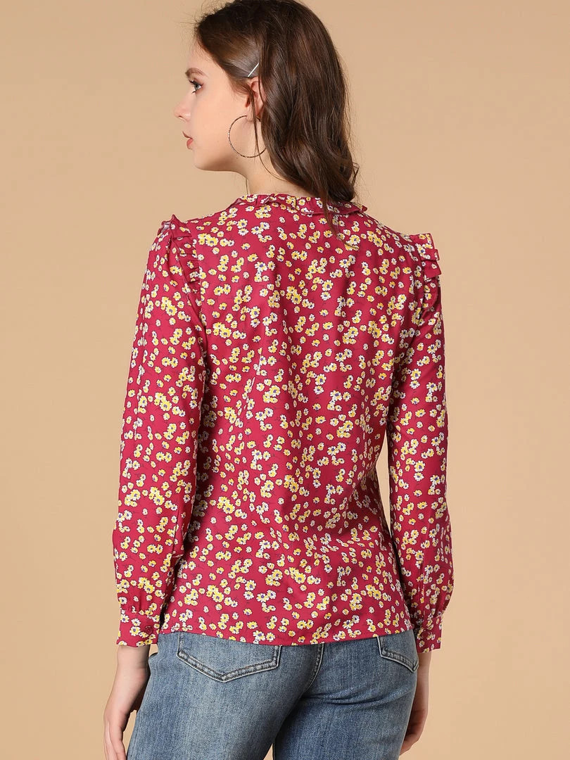 Allegra K Boho Daisy Floral Ruffled Neck Long Sleeve Tops Blouses