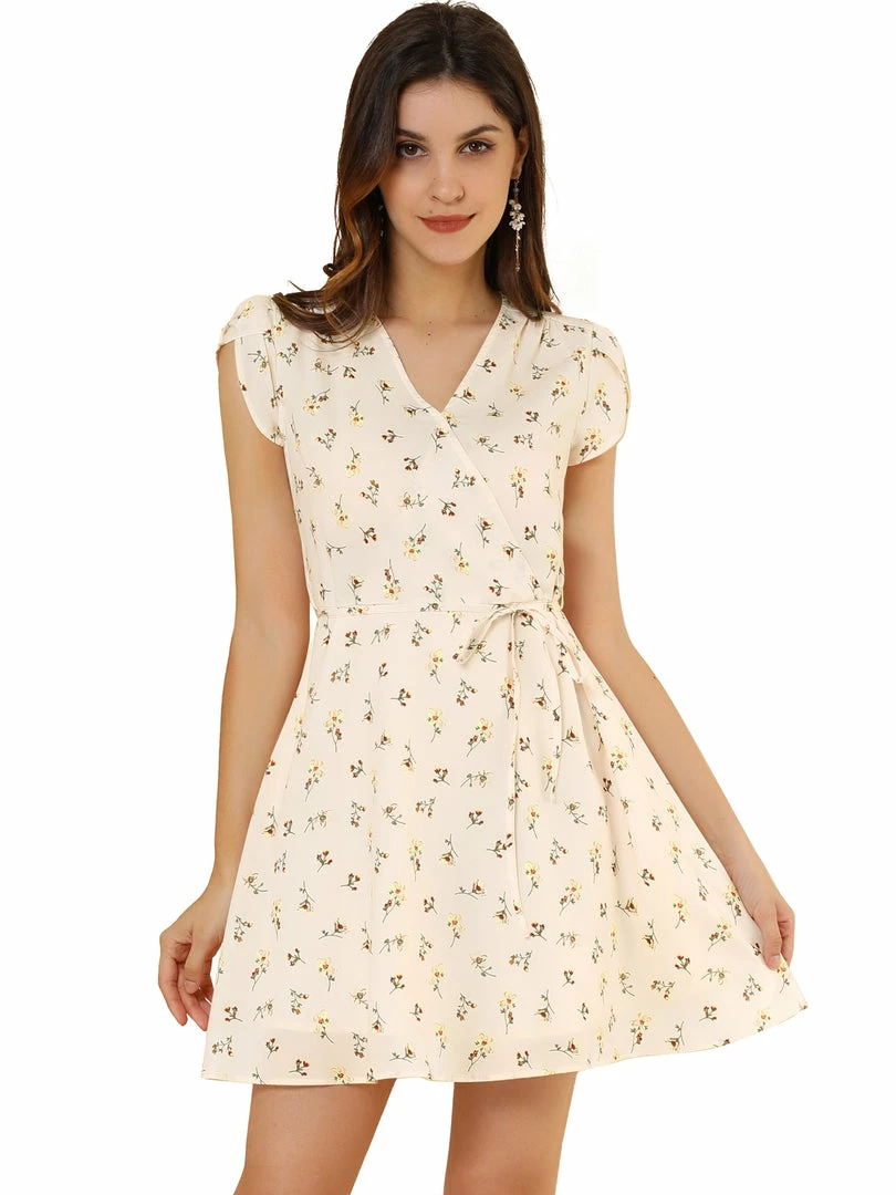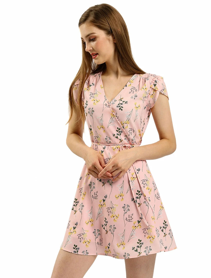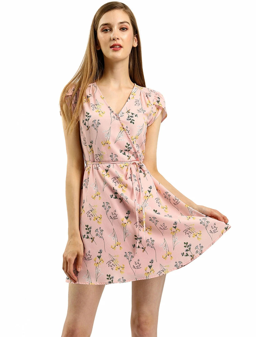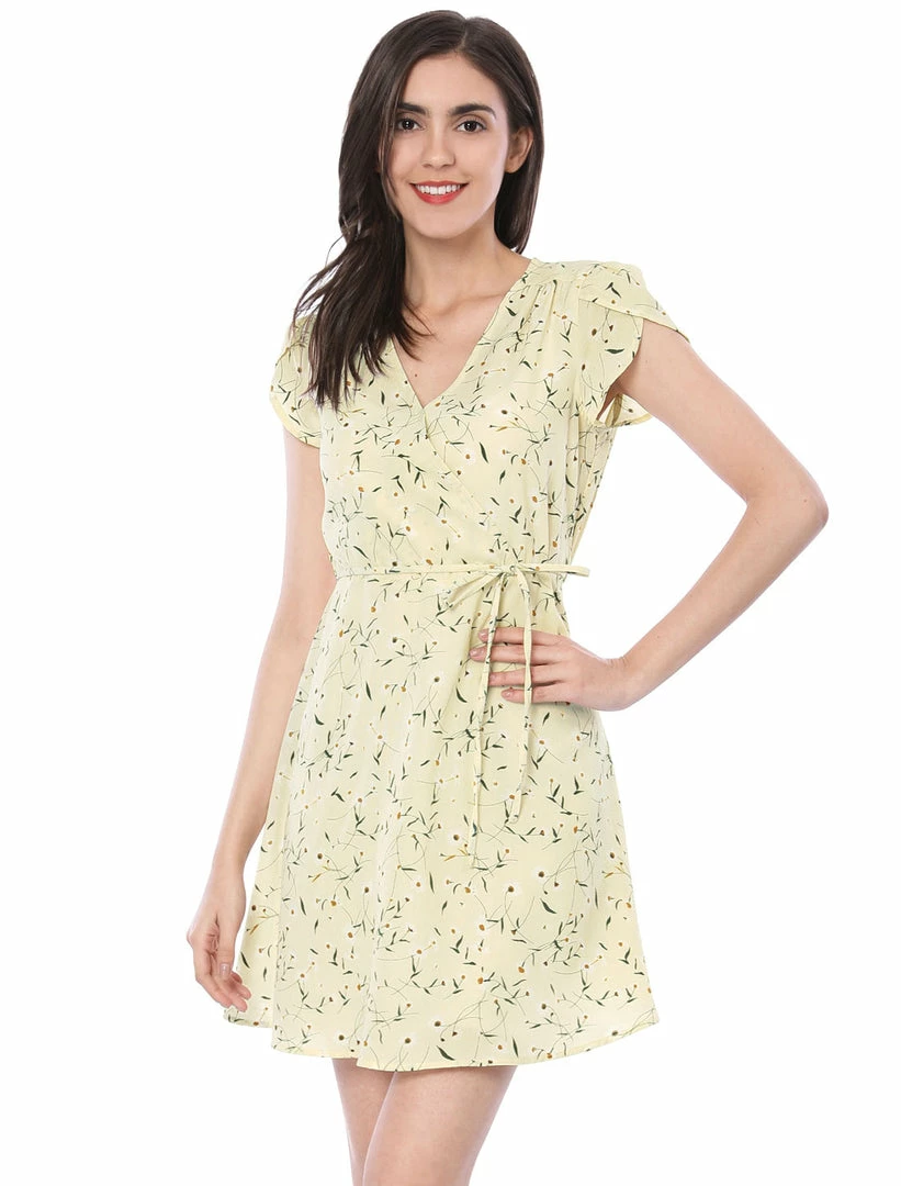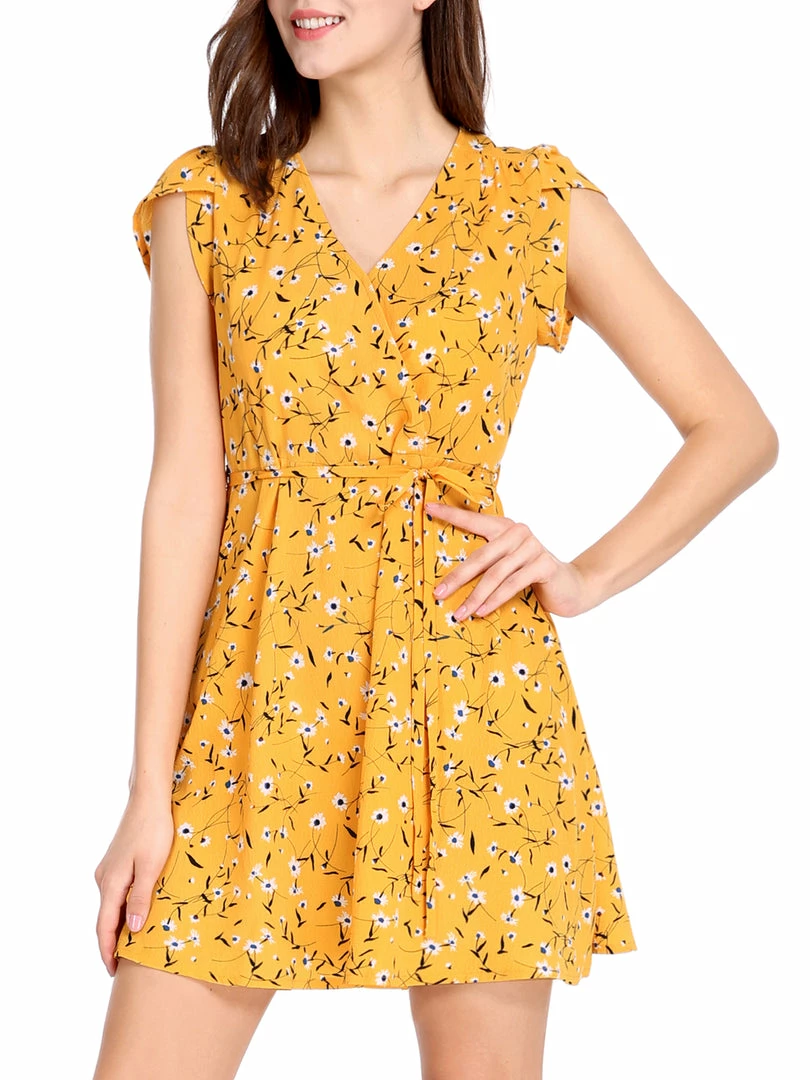 • From its petal sleeves with shirring details to its self tie waist, this above knee dress defines a feminine silhouette.