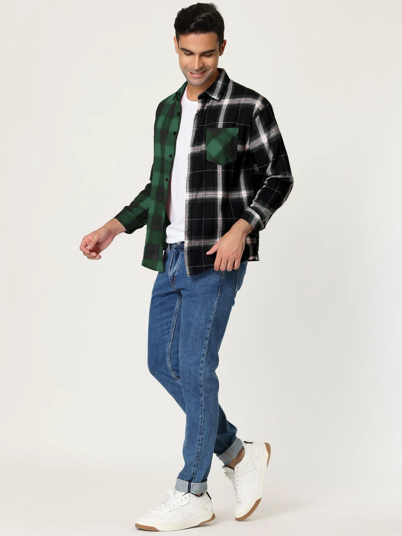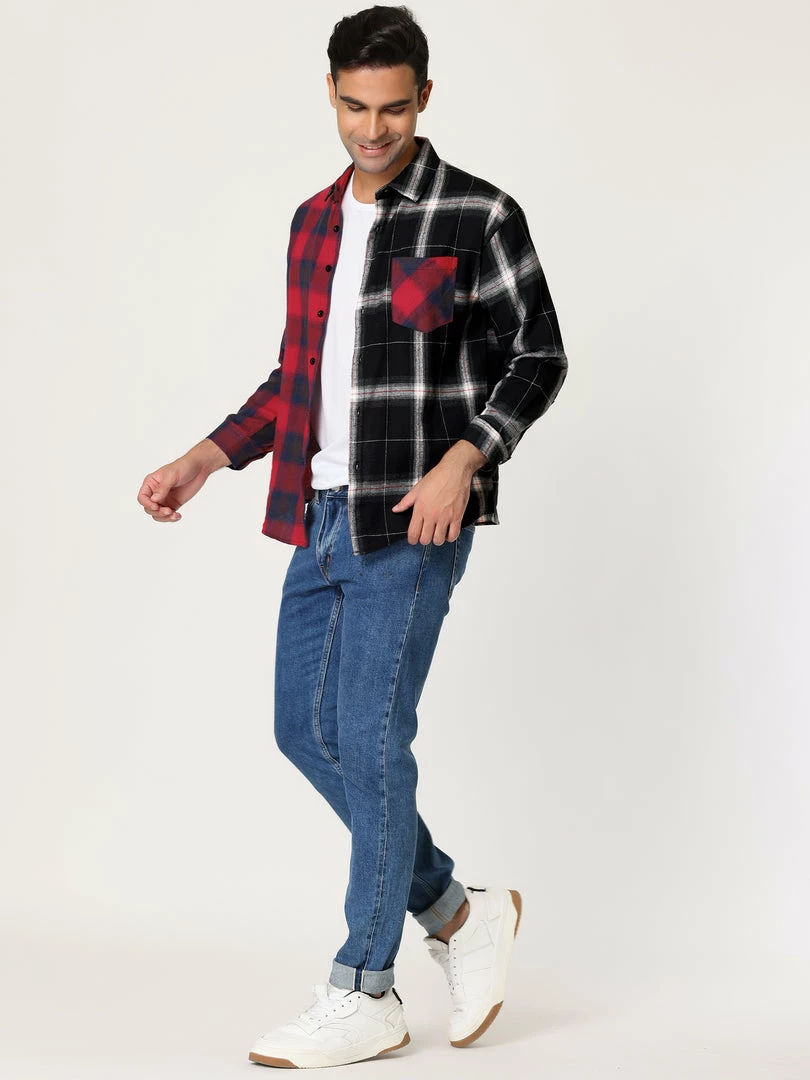 Allegra K Men’s Plaid Shirt Color Block Patchwork Long Sleeves Checked Shirt Jacket