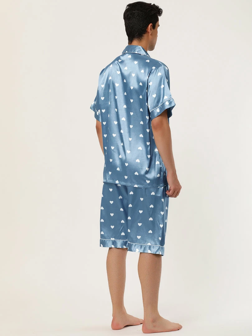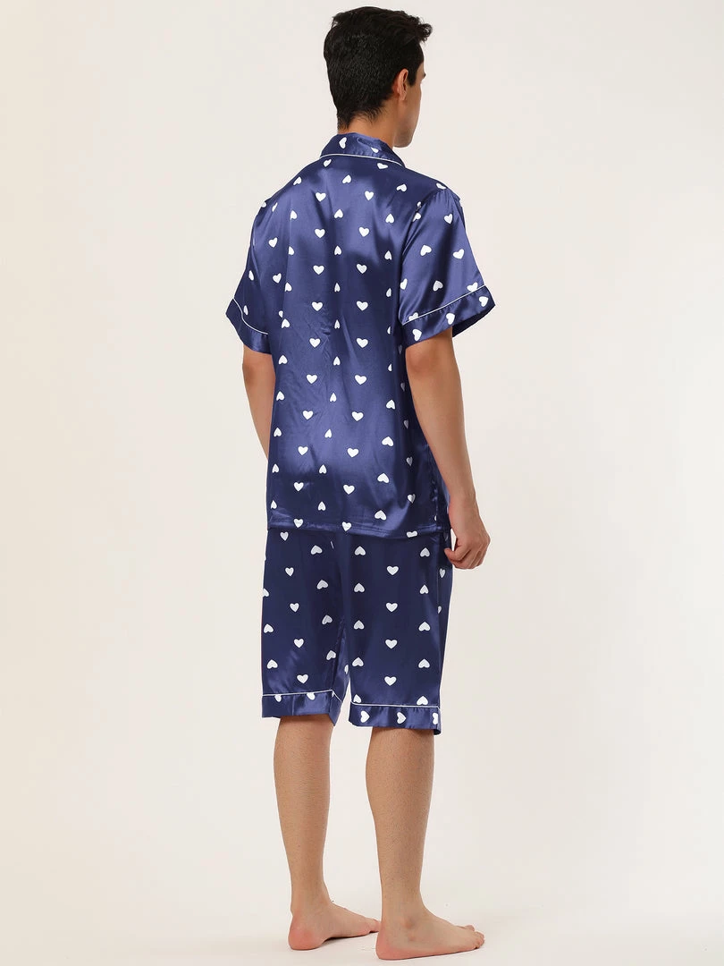 Allegra K Men’s Satin Pajama Set Cute Heart Print Button Down Short Sleepwear Loungewear Pjs Sets