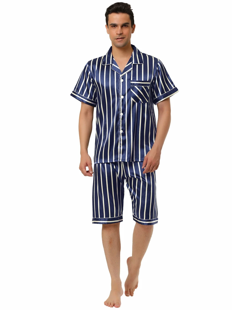 This men’s pajama is a summer short-sleeves vertical stripes style, satin fabric, notched collar, one chest pocket on the left side, stylish and casual at the same time.