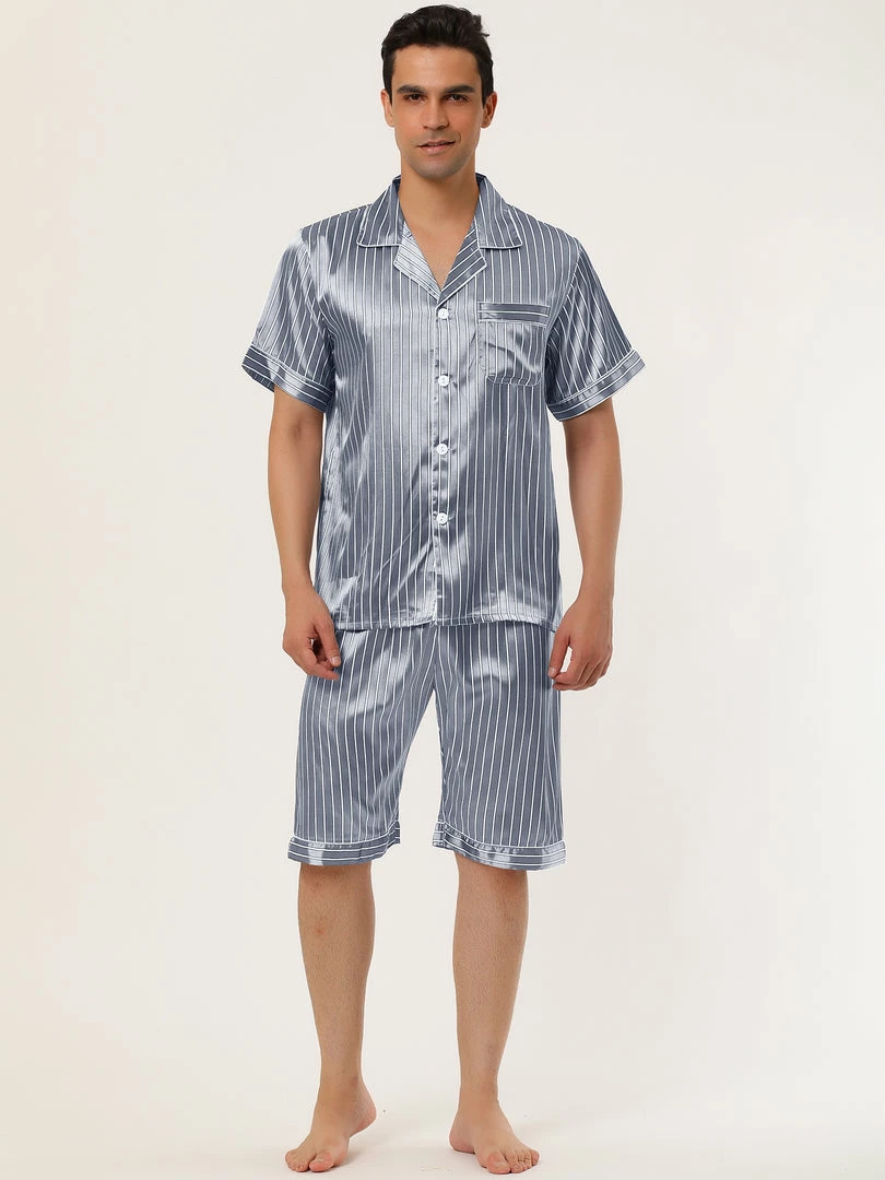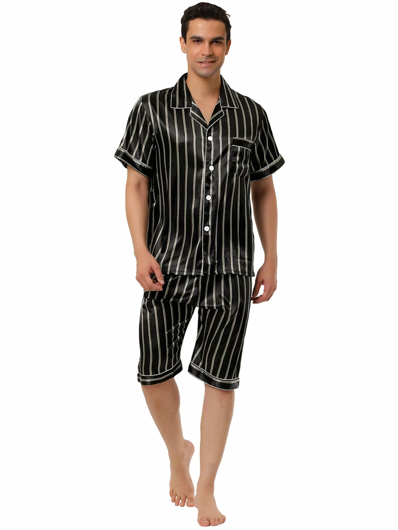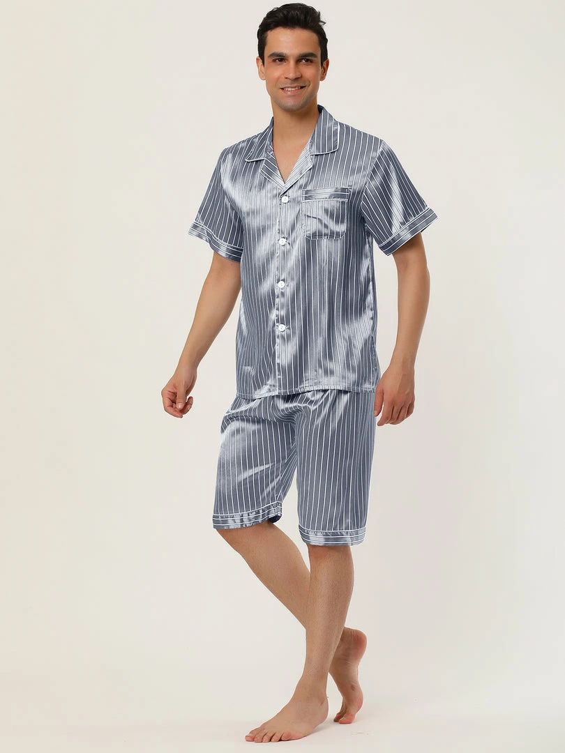 Allegra K Men’s Stripe Pajamas Set Summer Short Sleeve Button Down Satin Sleepwear
