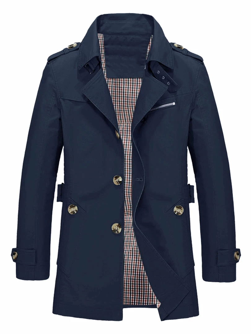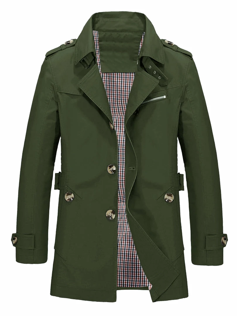 Notched collar, single breasted closure, classic trench coat for men.