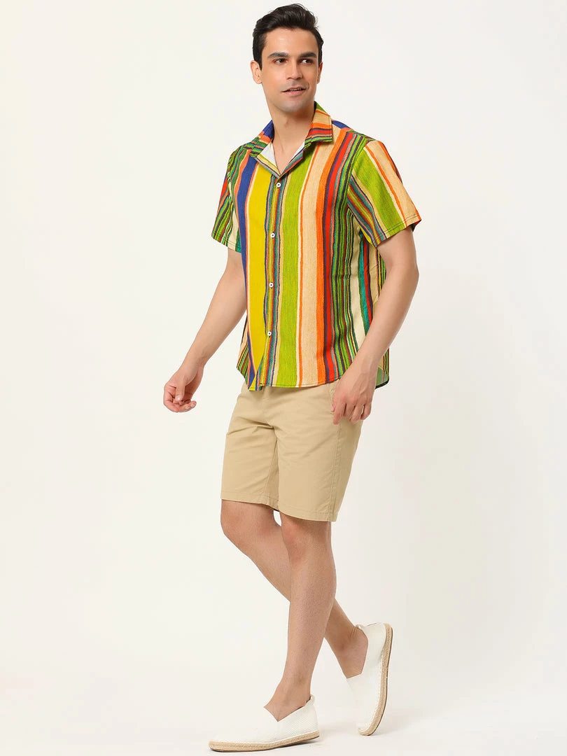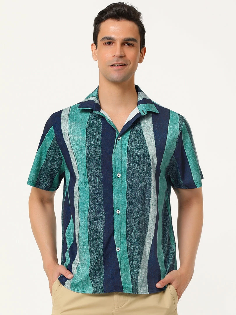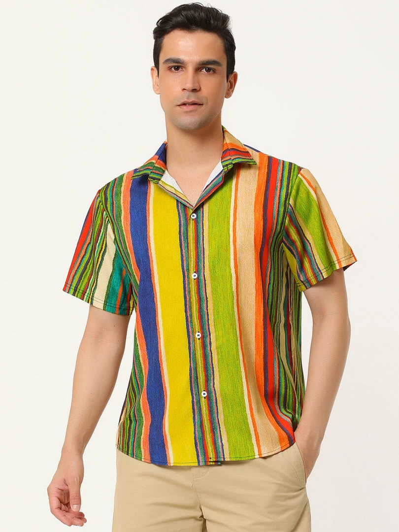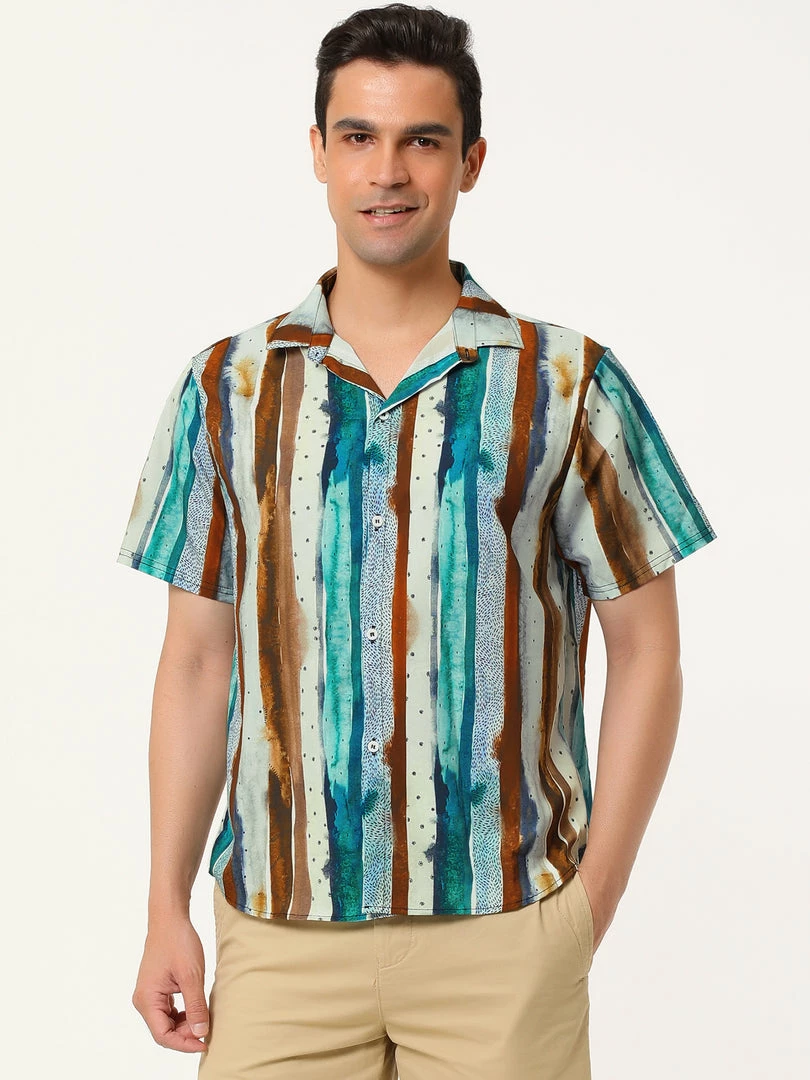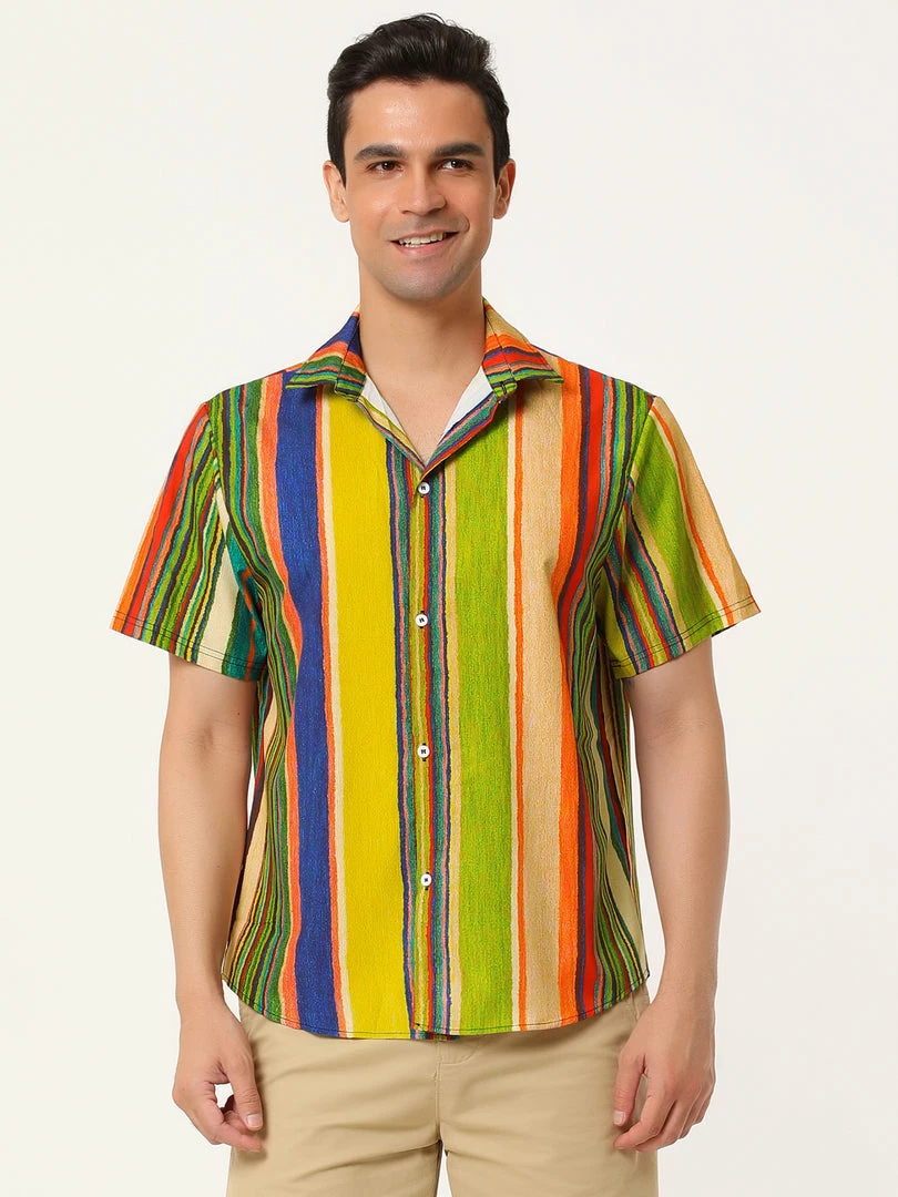 Allegra K Men’s Vertical Striped Shirt Short Sleeve Button Down Hawaiian Color Block Stripes Shirts
