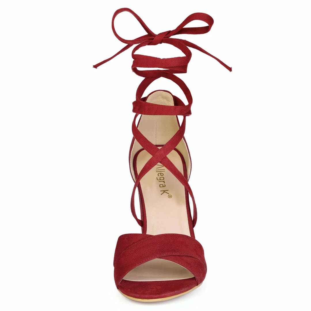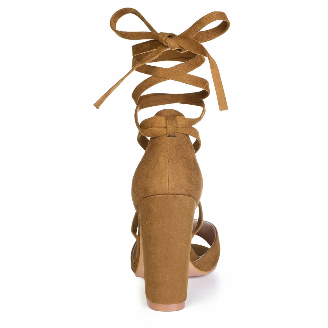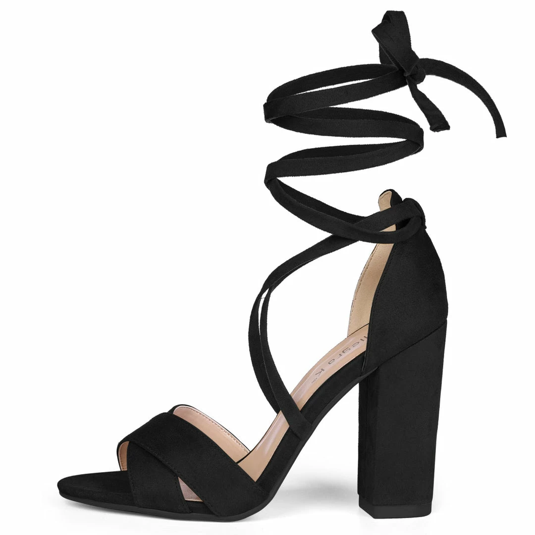 A pair of block-heel sandal features a simple ankle wrap with crisscross design. Knot the ties into a pretty bow at the back to make a lasting impression as you walk away.