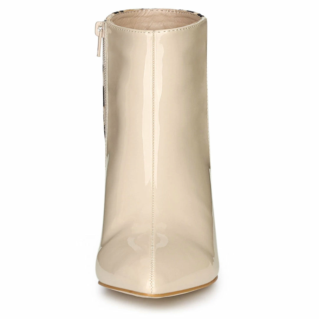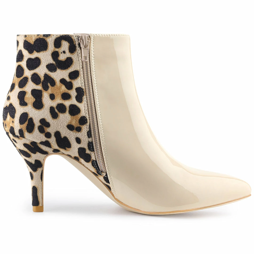 The contrast color high heel ankle boots, hot in trend and fashion; and even better in a trendy leopard print. They’ve been crafted from faux suede and patent leather, decorated with leopard spots and set on a sturdy 80mm stiletto heel. Wear them with everything from denim to tailoring.