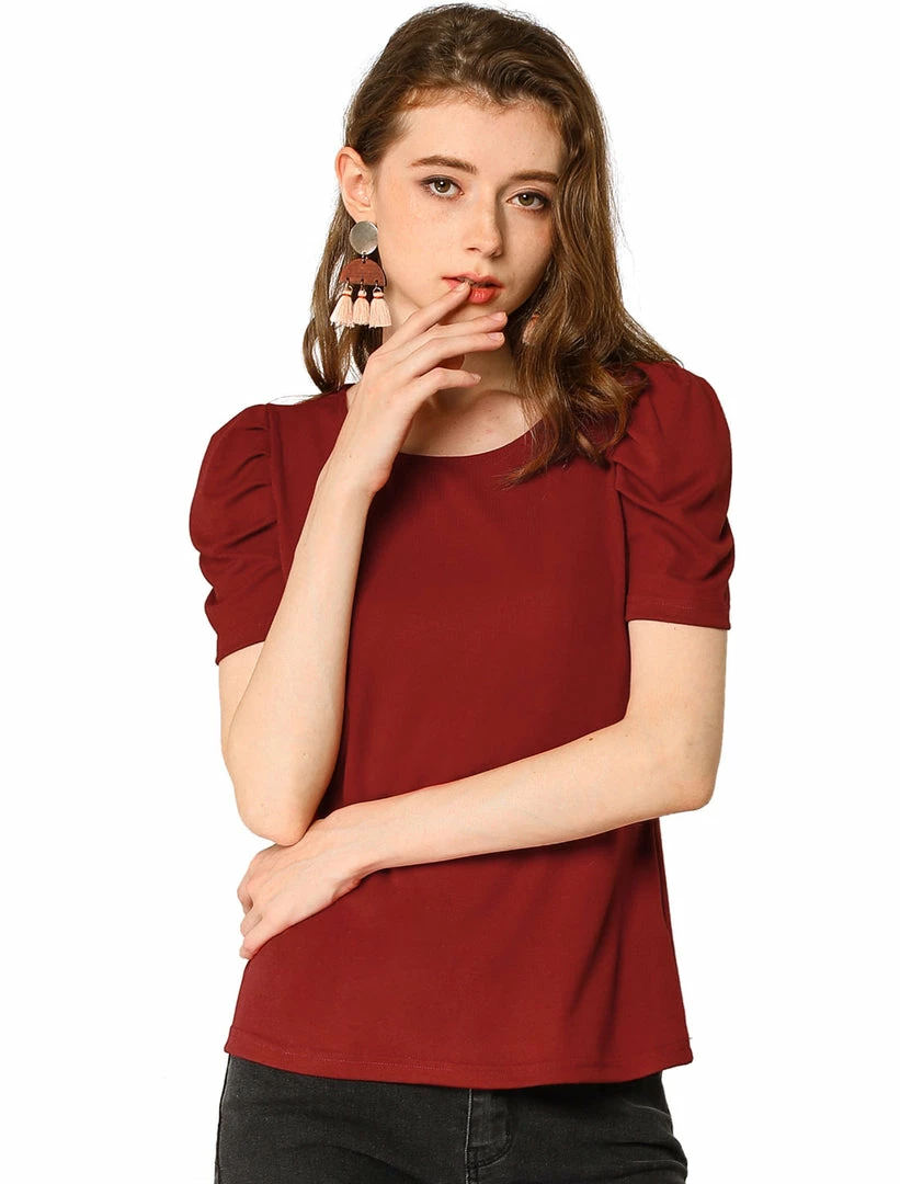 Allegra K The Summer Chill Women’s Ruched Puff Sleeve Round Neck Slim Fit Solid Color Top Shirt