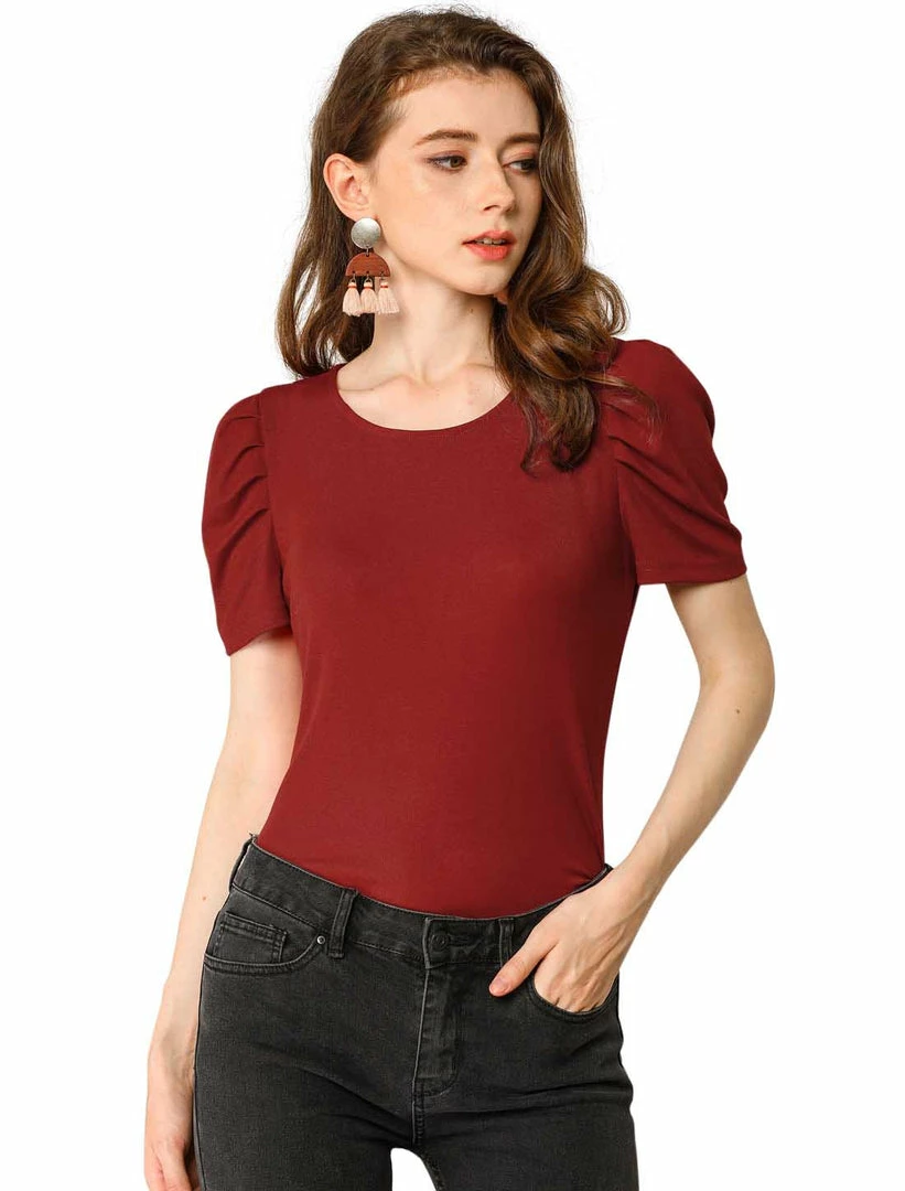 - Soft stretch knit shapes this tasteful tee with a round neckline, and short puff sleeves with ruched detailing.
