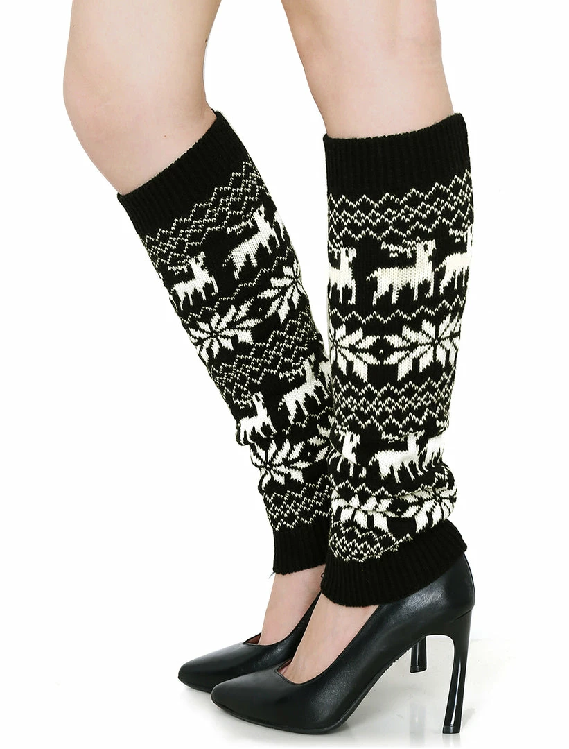 Elastic Cuffs, Snowflake, Deers Pattern, Knee High, Footless, Stretchy, Ribbed Cuffs, Knit, Leg Warmers