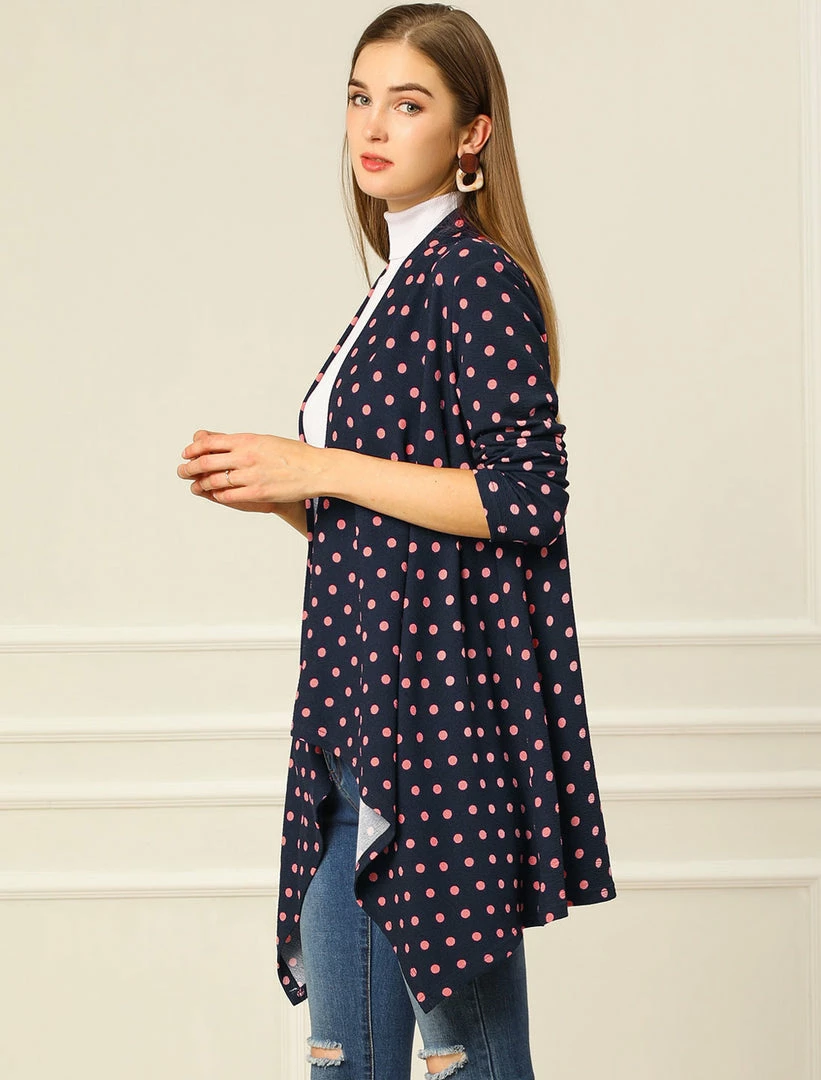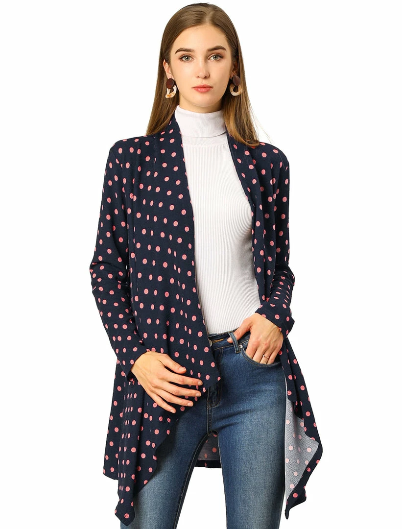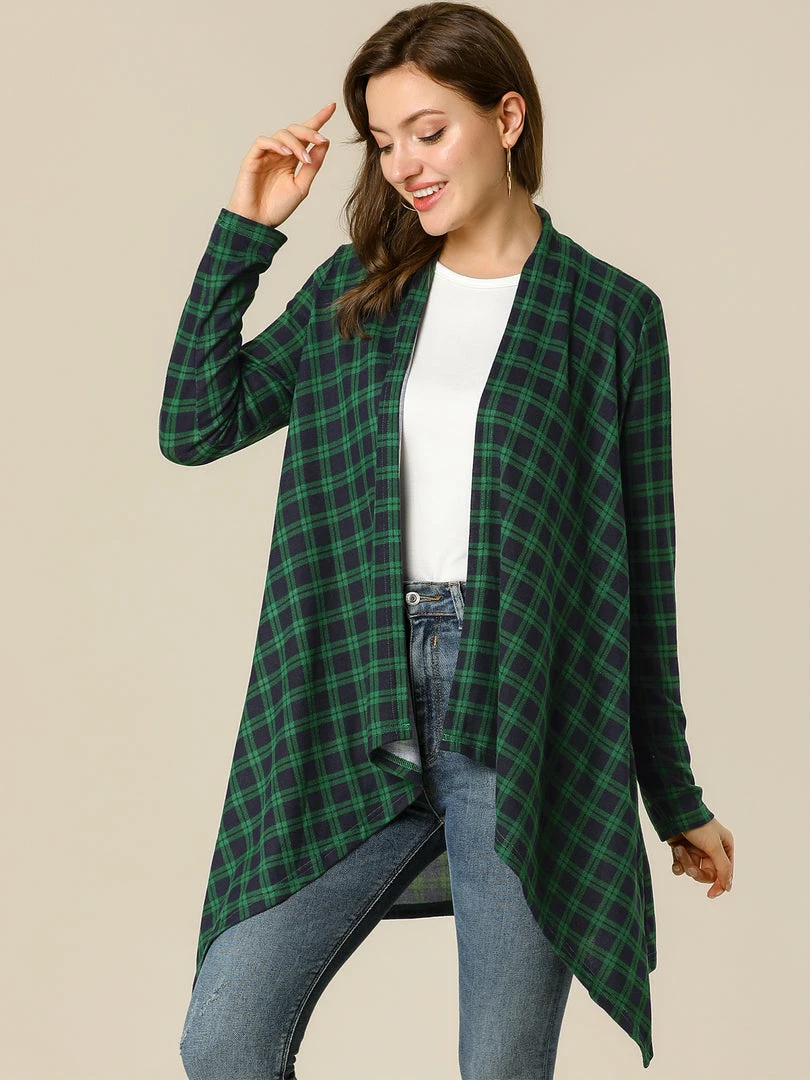 • The ideal layering piece for transitioning into milder months, this plaids cardigan is made with a handkerchief hem, open-front silhouette and long sleeves.