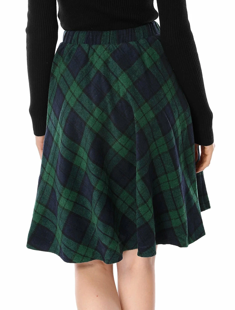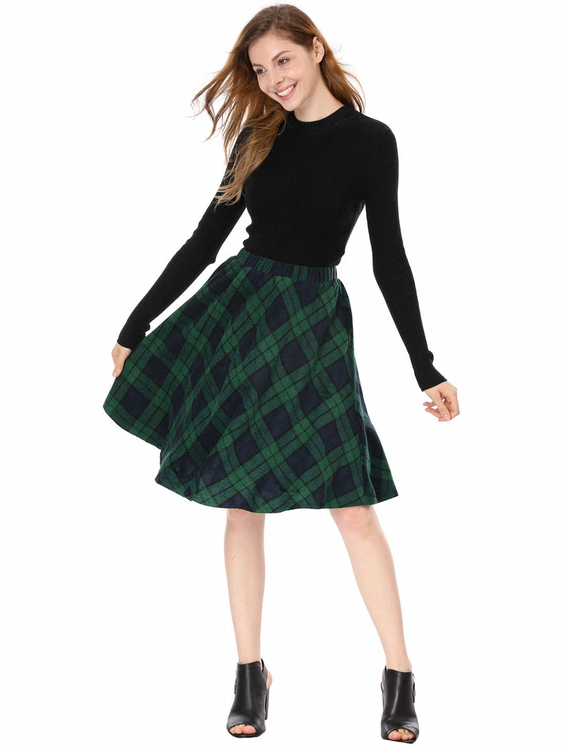 • A classic plaids worsted skirt inspired by perennially chic schoolgirl style is made modern for fall with an elastic waist that adds movement to the knee-length silhouette.