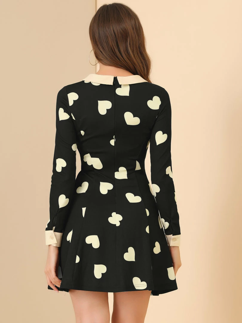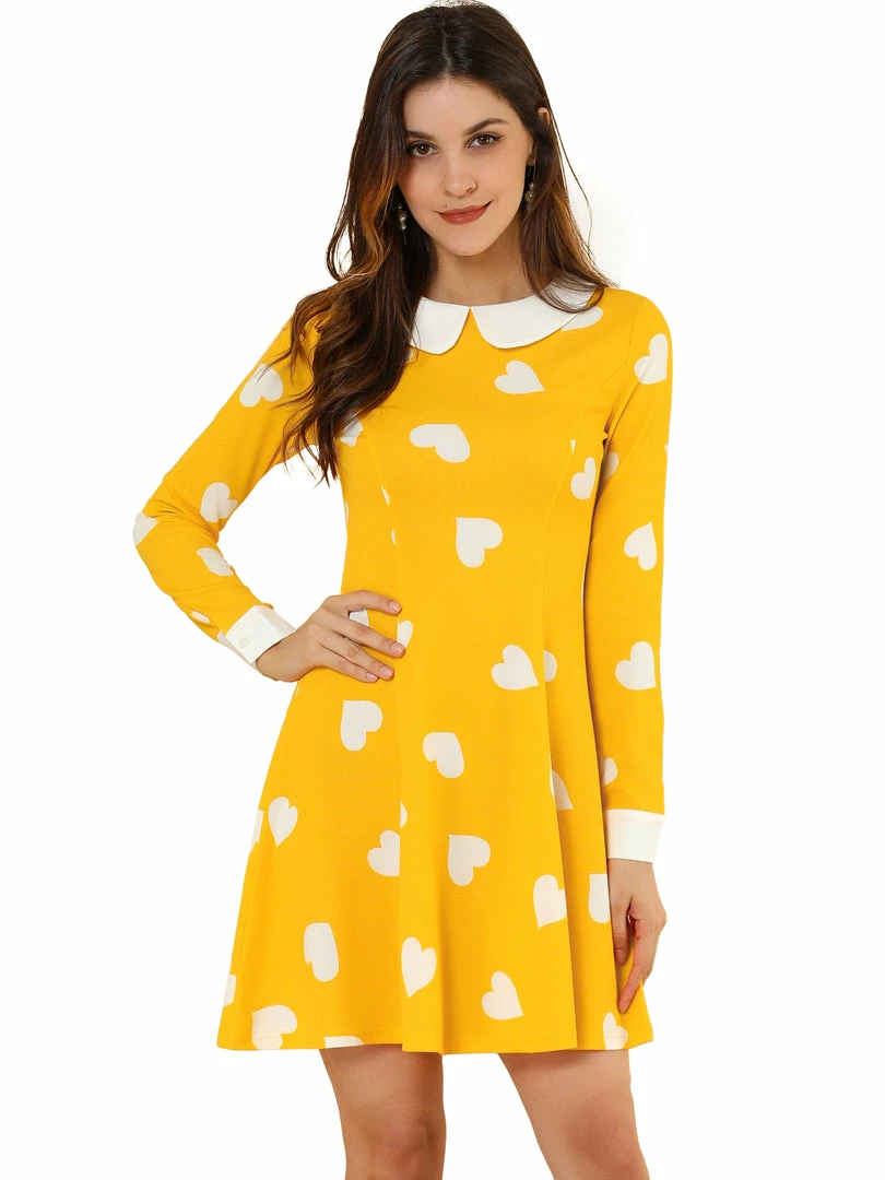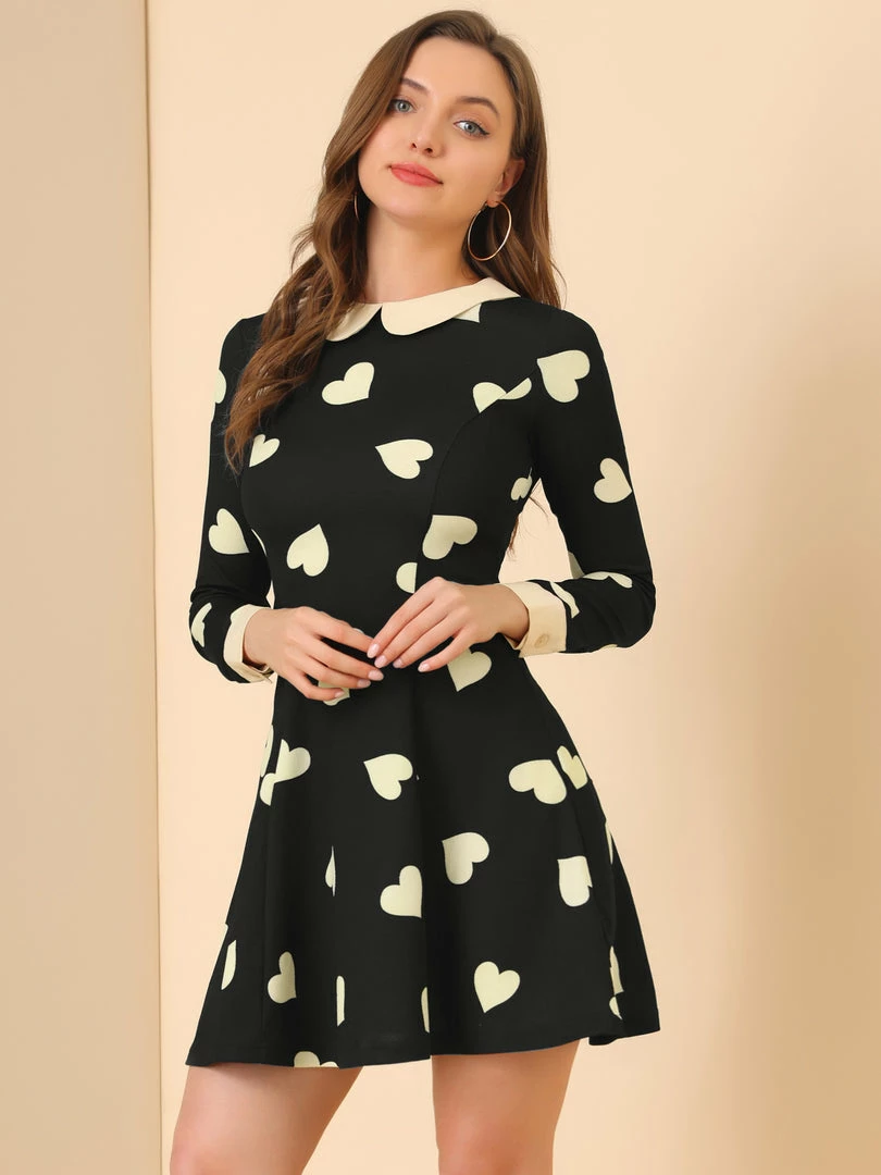 • As your new record starts to spin, so does the a-line silhouette of this dress. With its contrast peter pan collar, brilliant polka dot print, and long sleeves, this simple, sweet frock is the perfect to show feminine of you.