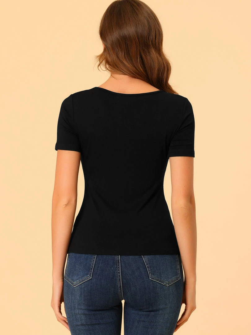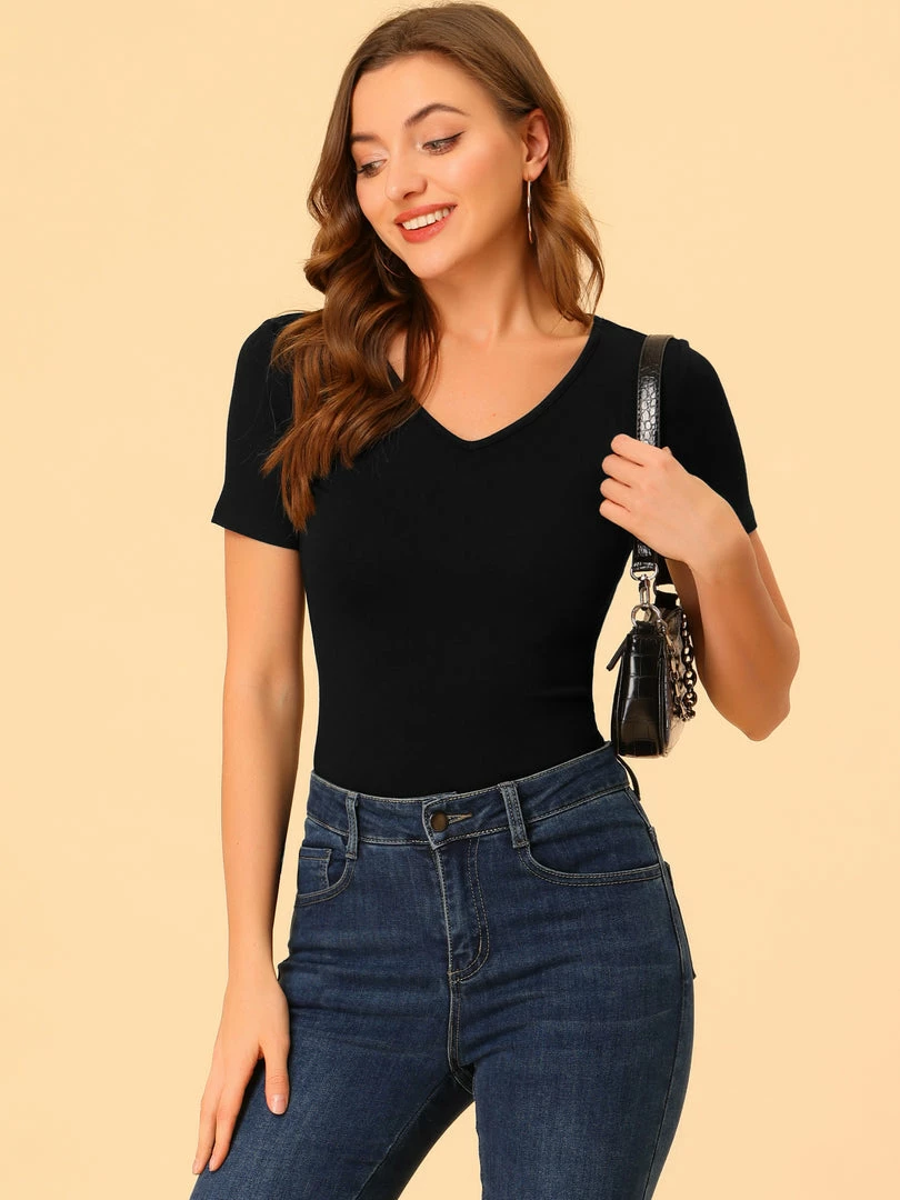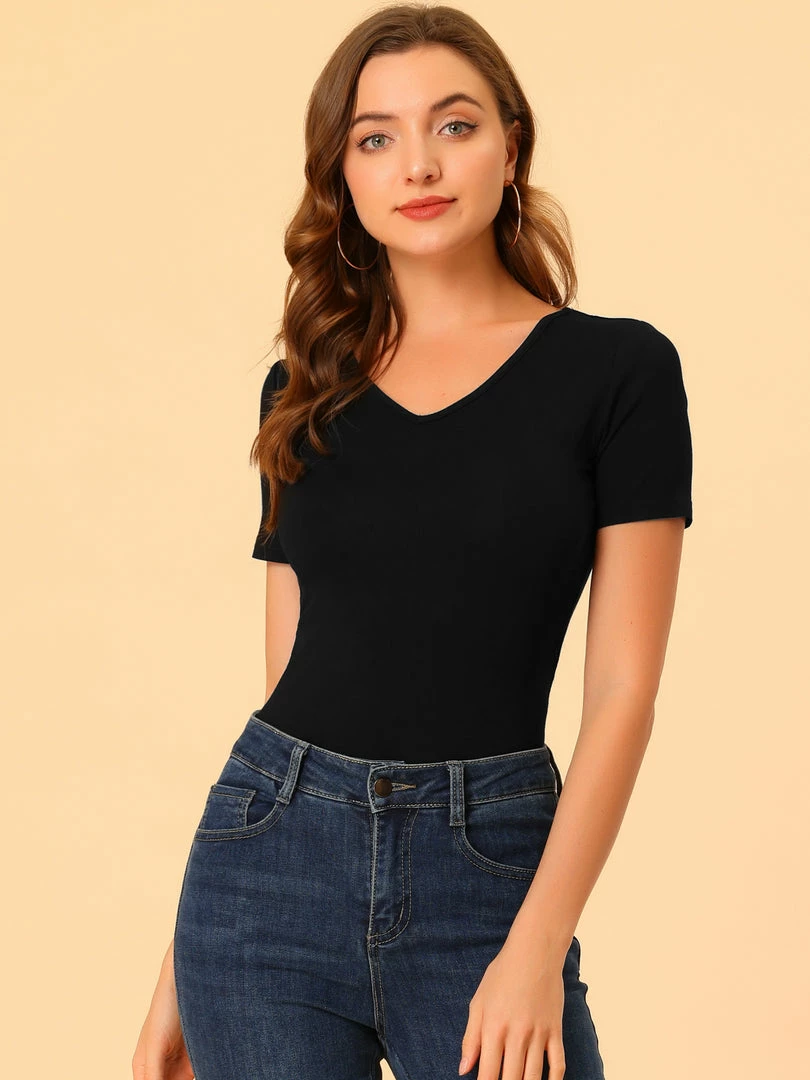 Allegra K Women’s Basic Top V Neck Short Sleeves Fitted Casual Soft T-Shirt