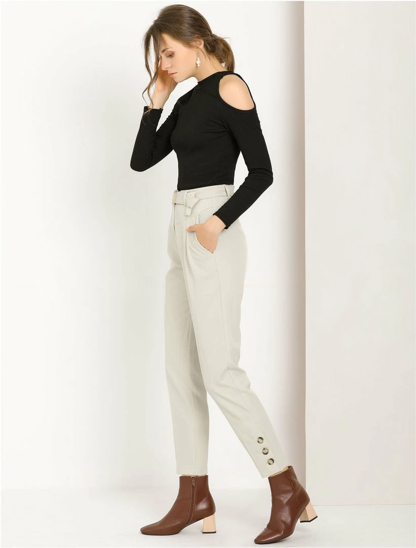 Allegra K Women’s Belted High Waist Zipper Straight Solid Button Decor Pants