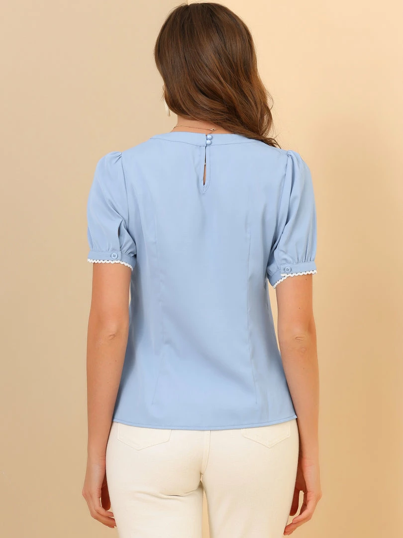 Women Casual Summer Short Sleeve Blouse Round Neck Button Cuff Workwear Top Shorts