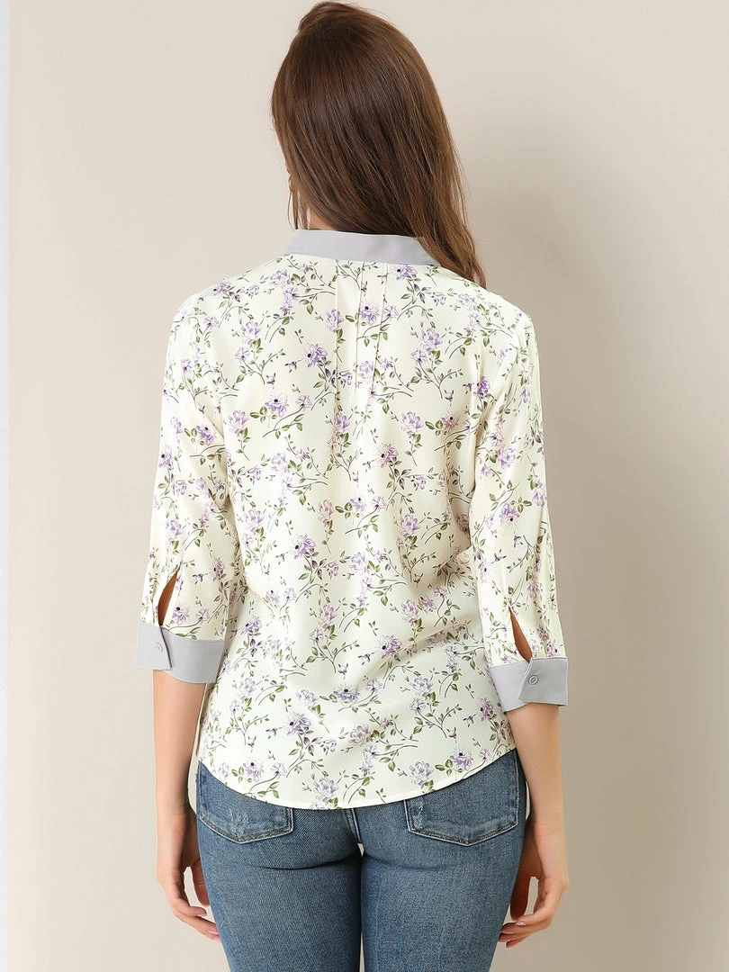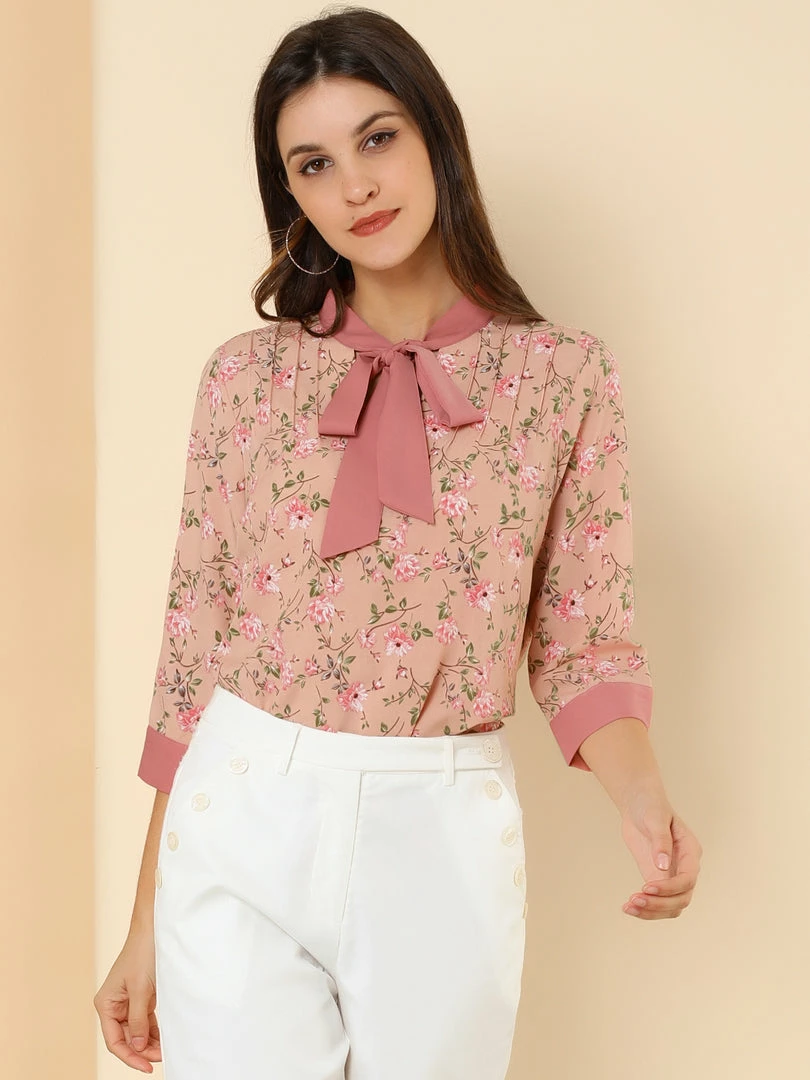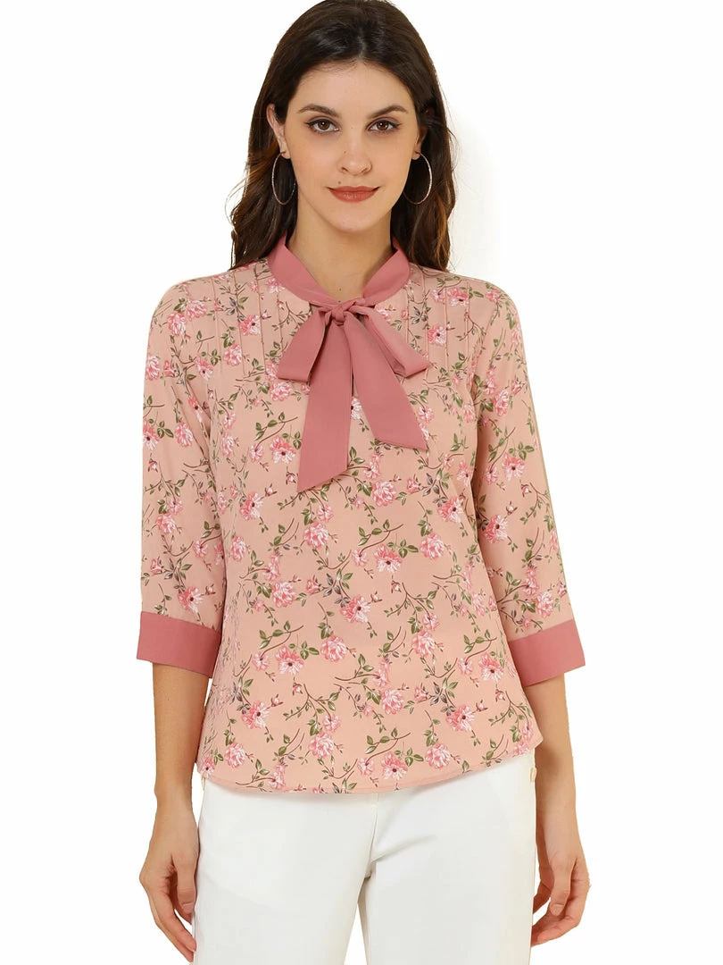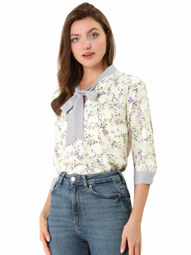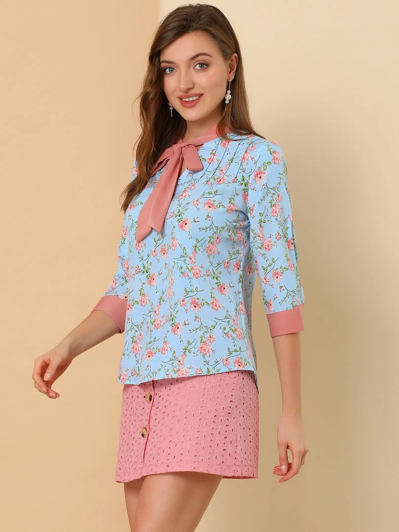 Allegra K Women’s Bow Tie Neck Contrast Trim 3/4 Sleeve Floral Blouse Tops