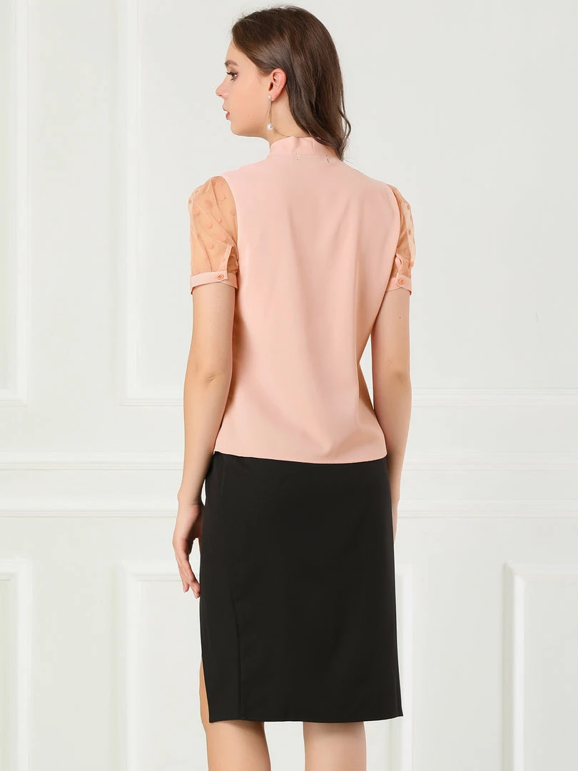 Allegra K Women’s Bow Tie Neck V Neck Stand Collar Short Mesh Sleeve Blouse
