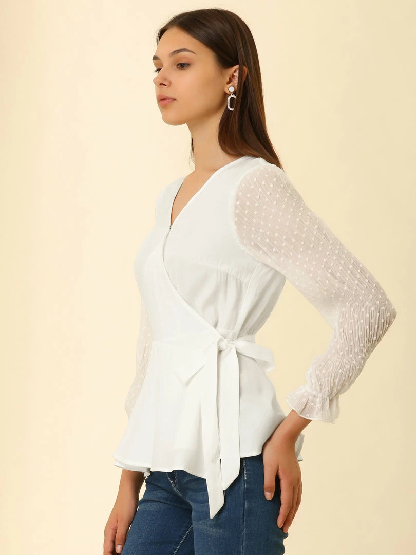 - V Neck, Long Sleeve, Elastic Ruffle Cuff, Solid Color, Wrap Tops, Bow Tie Waist, Puff Swiss Dots Semi-sheer Sleeve, Unlined.