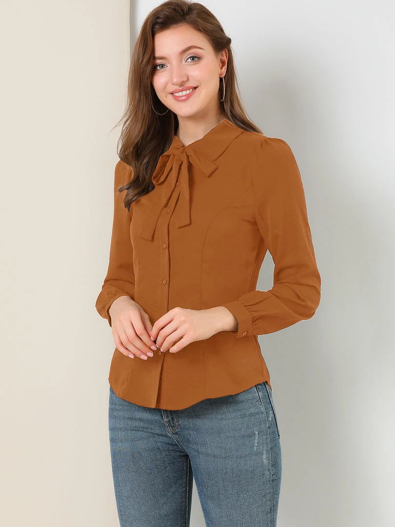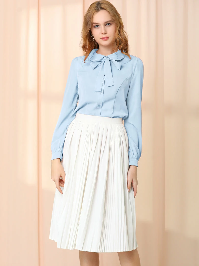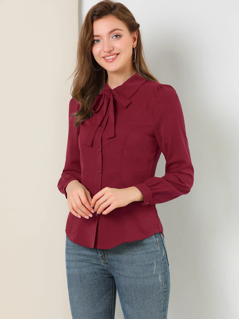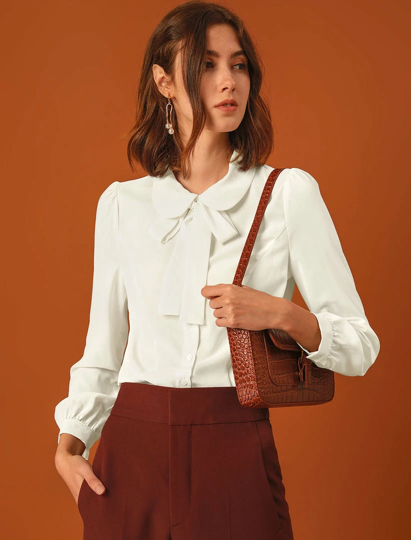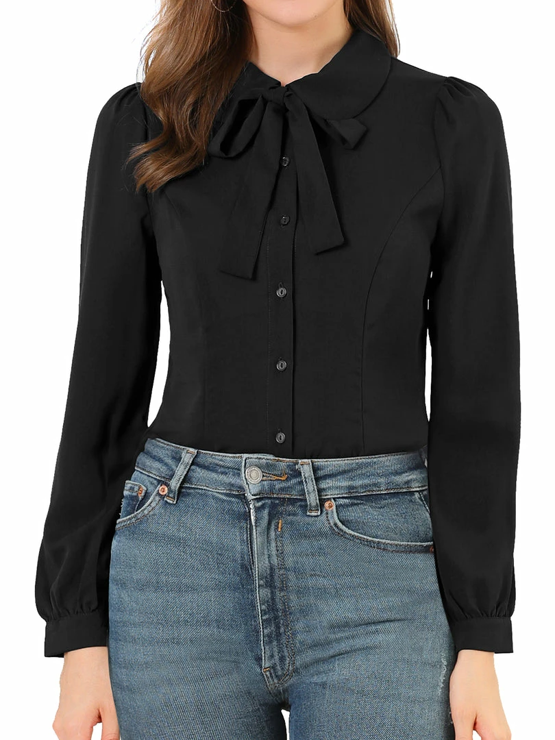 Allegra K Women’s Button Down Shirt Peter Pan Collar Long Sleeve Bow Tie Neck Blouse