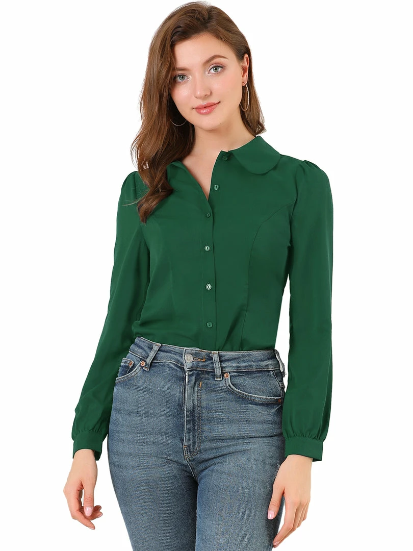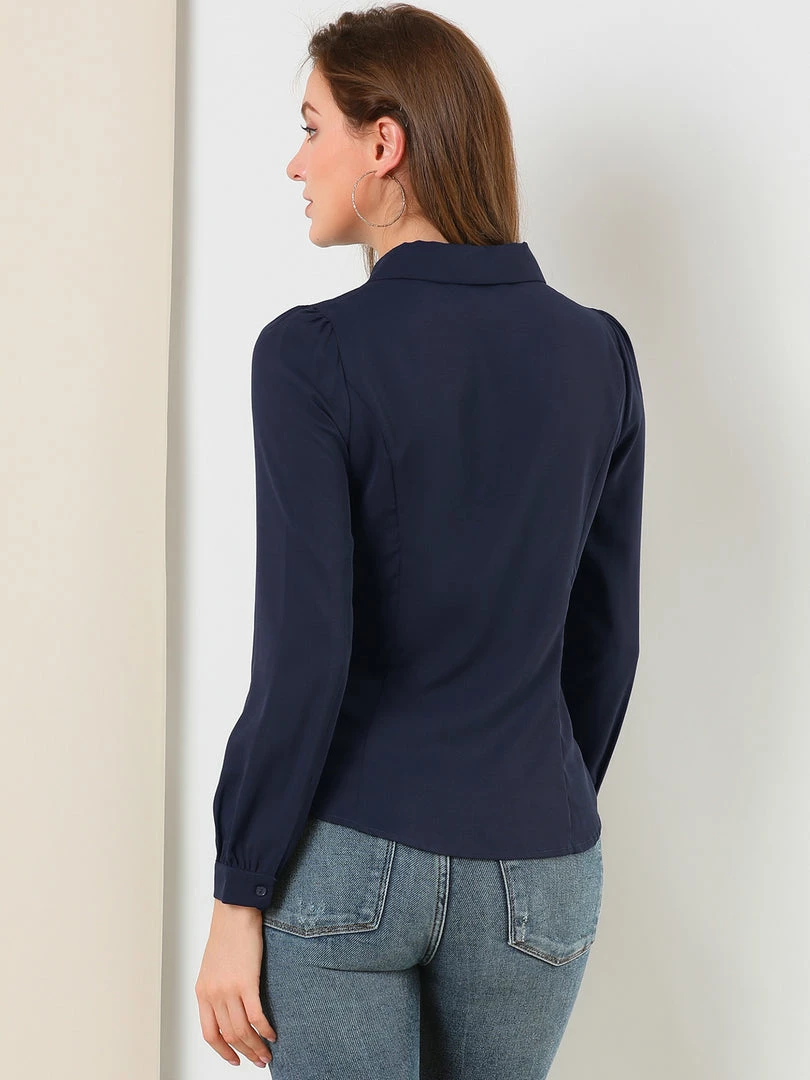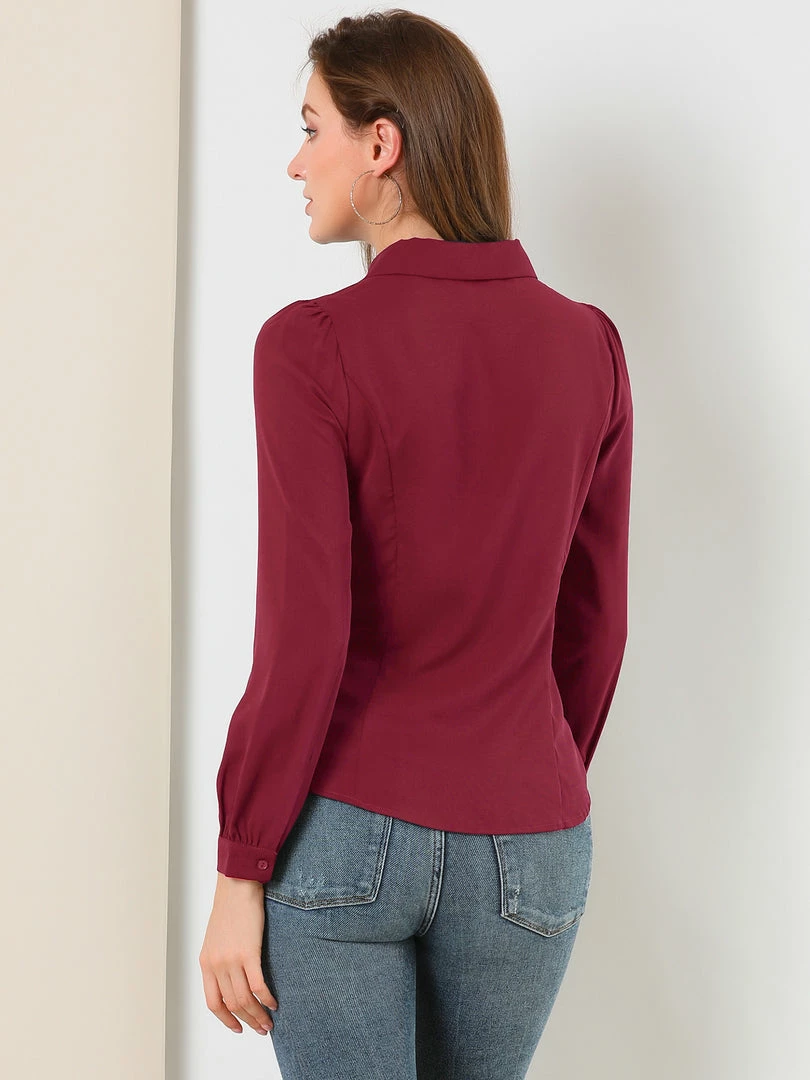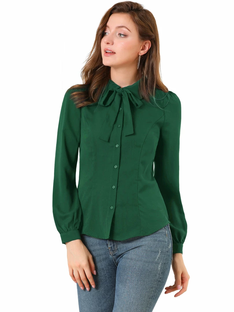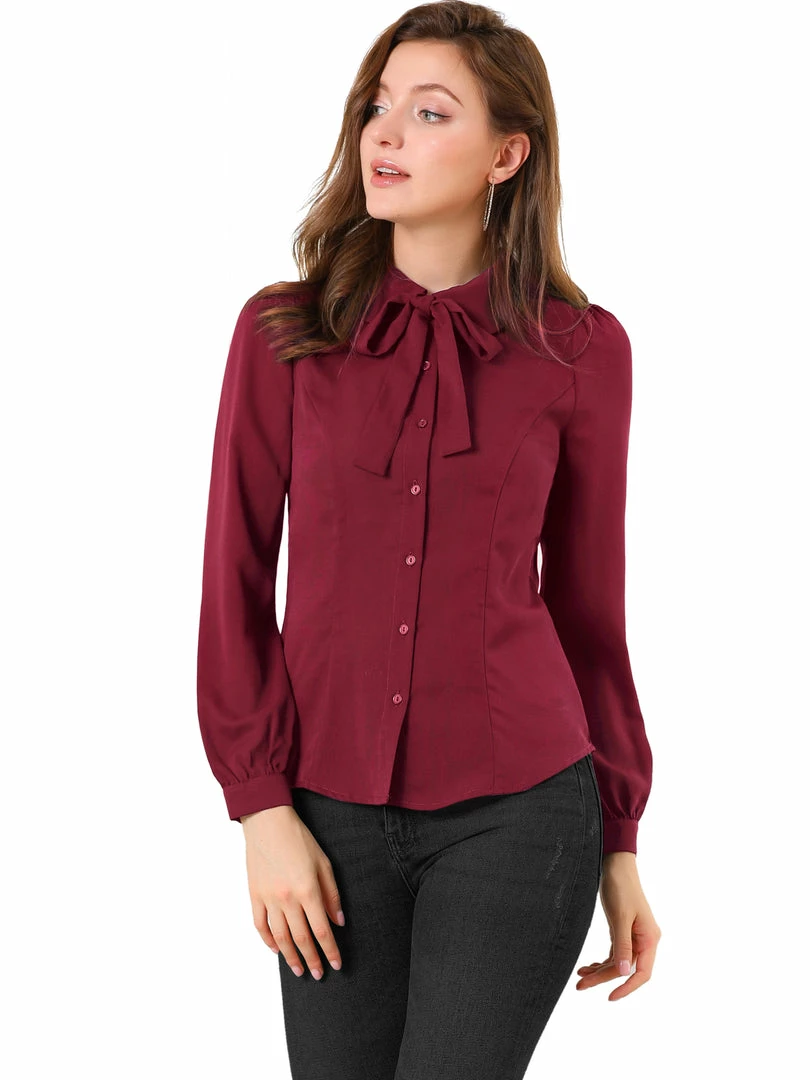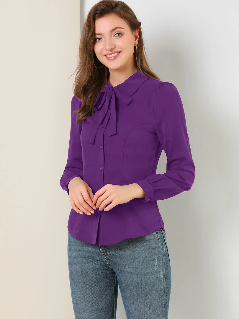 Allegra K Women’s Button Down Shirt Peter Pan Collar Long Sleeve Bow Tie Neck Blouse