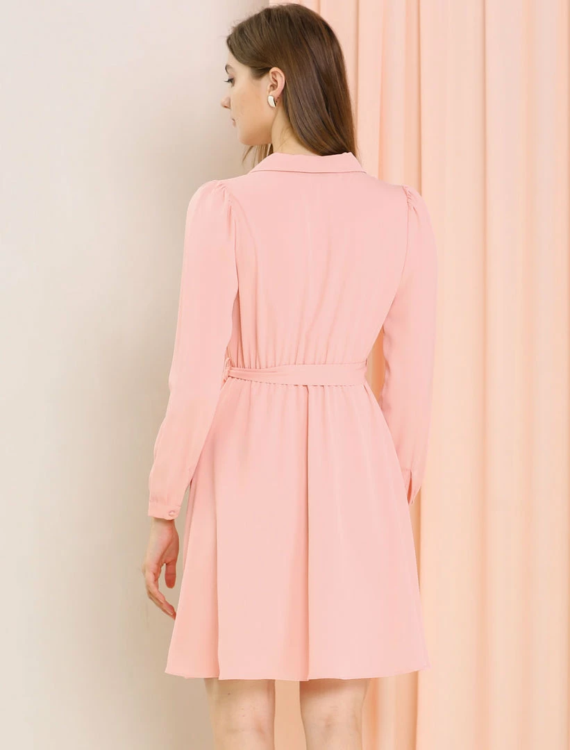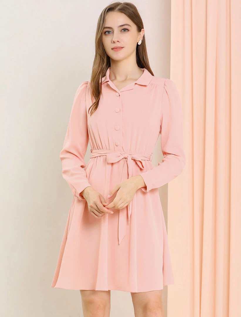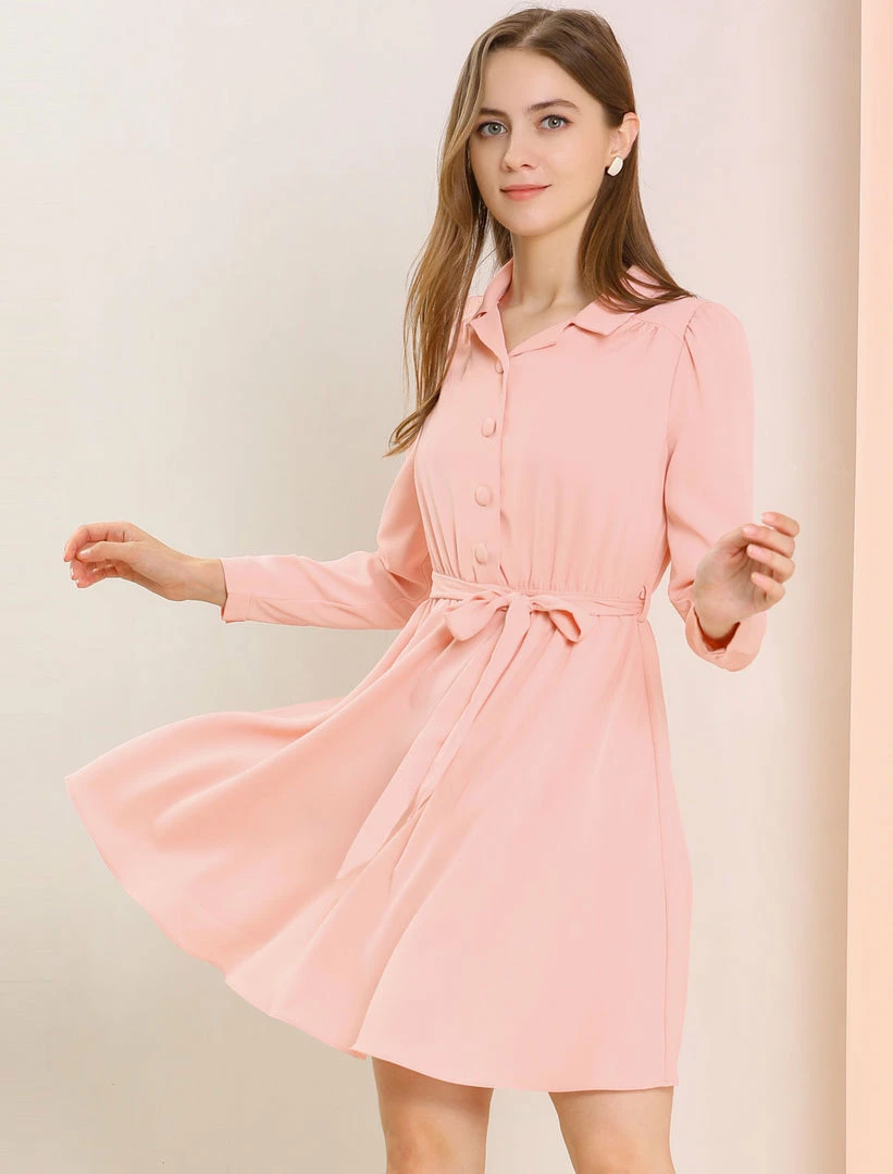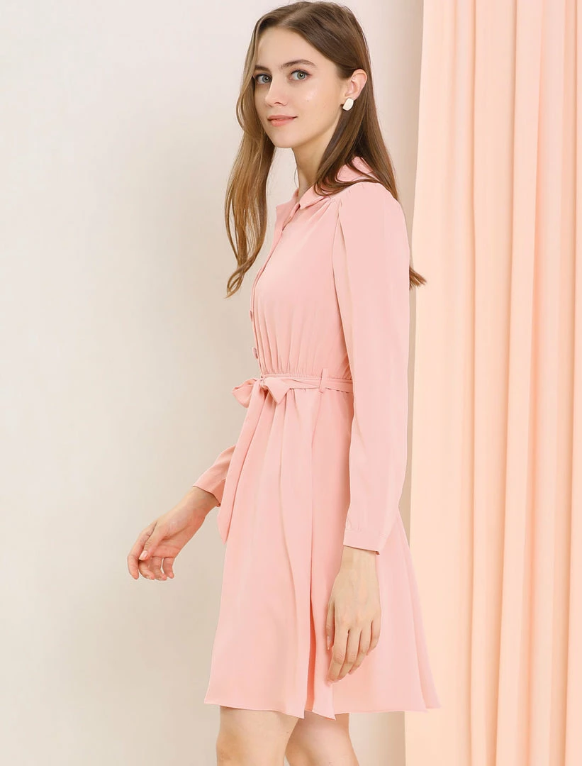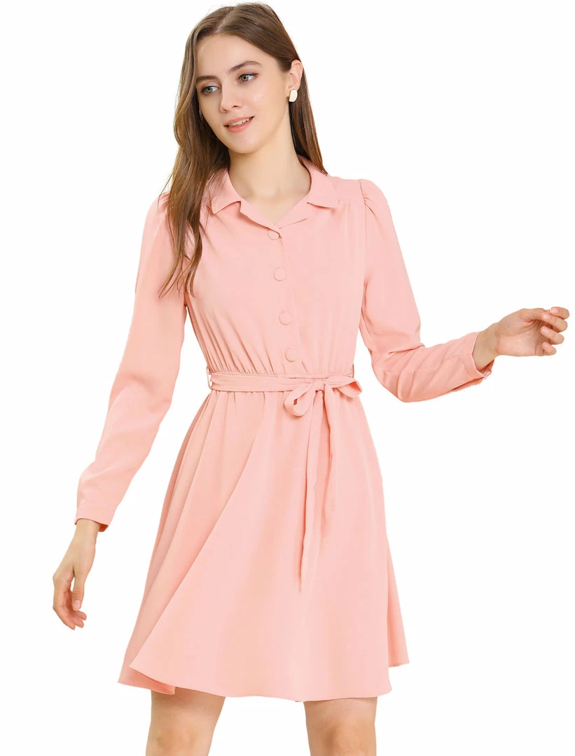 - Simple and delicate, this dress is complete with a notched lapel, camp collar, button front, self-tie belt, and elastic waist.