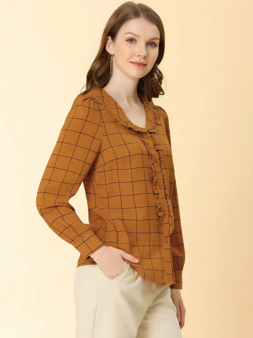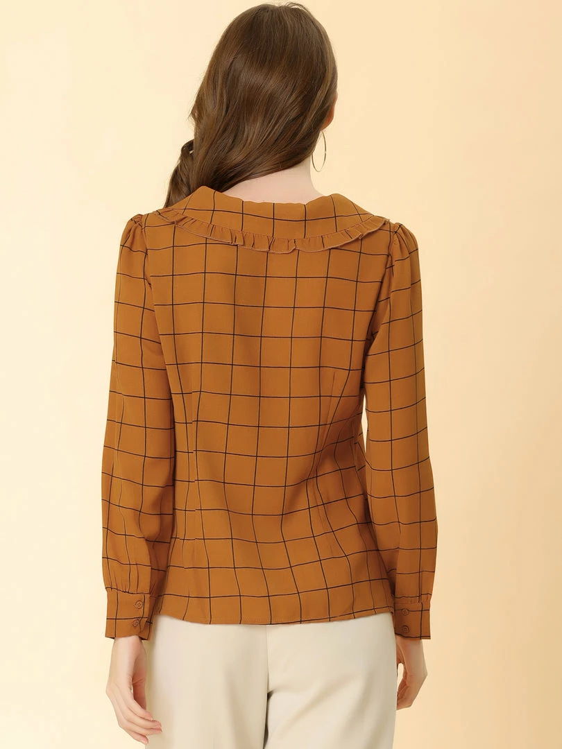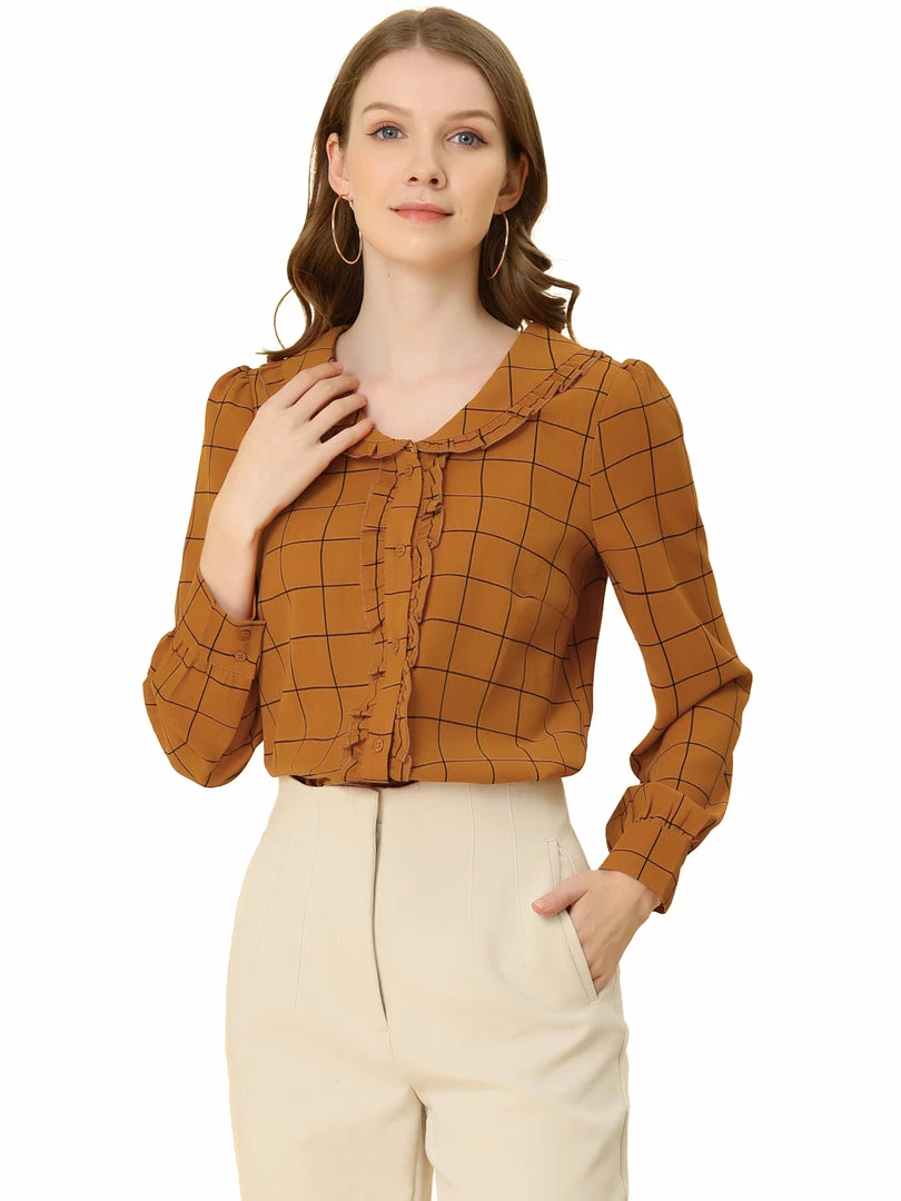 Allegra K Women’s Button Front Long Sleeve Collared Ruffle Plaid Shirt Blouse