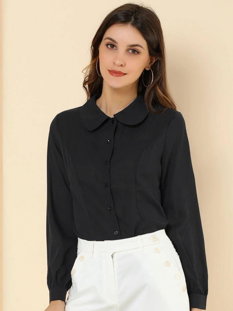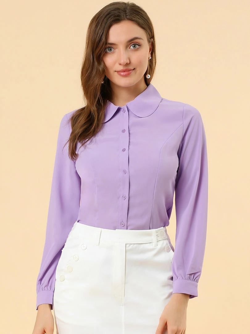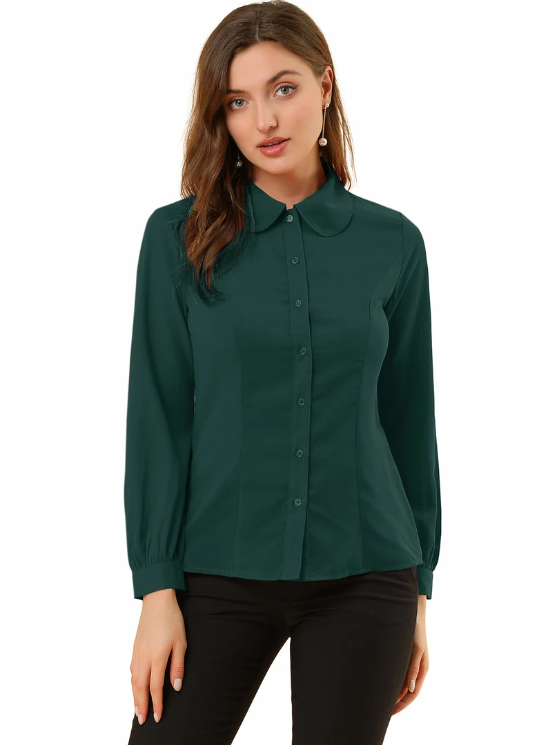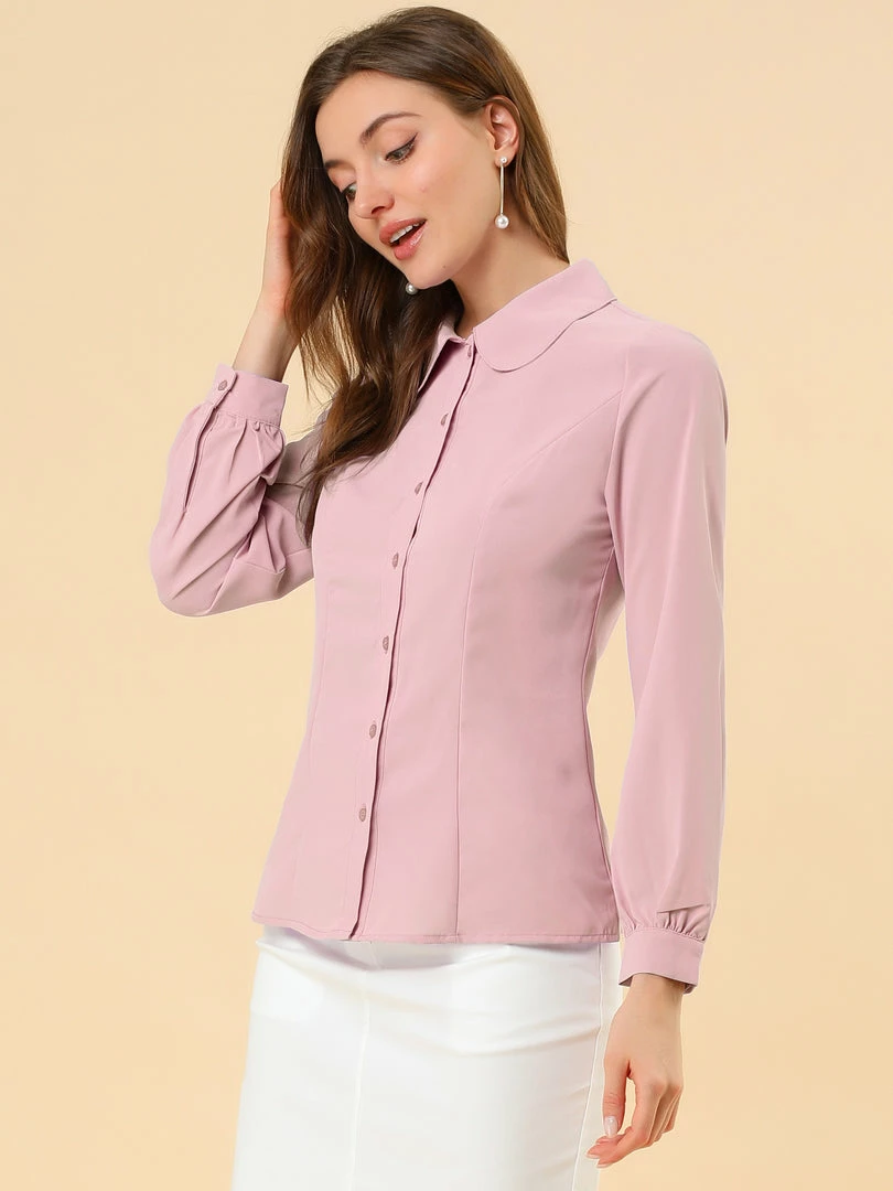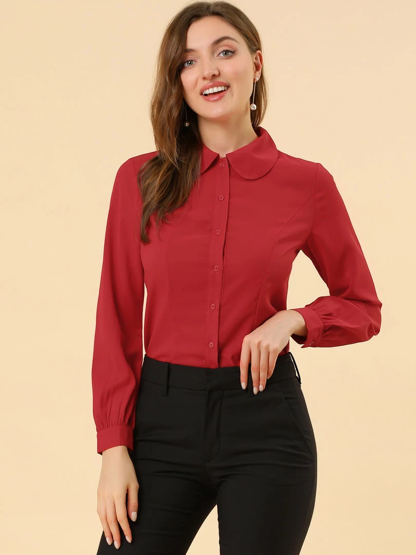 Allegra K Women’s Button Up Shirt Career Peter Pan Collar Long Bishop Sleeve Blouse