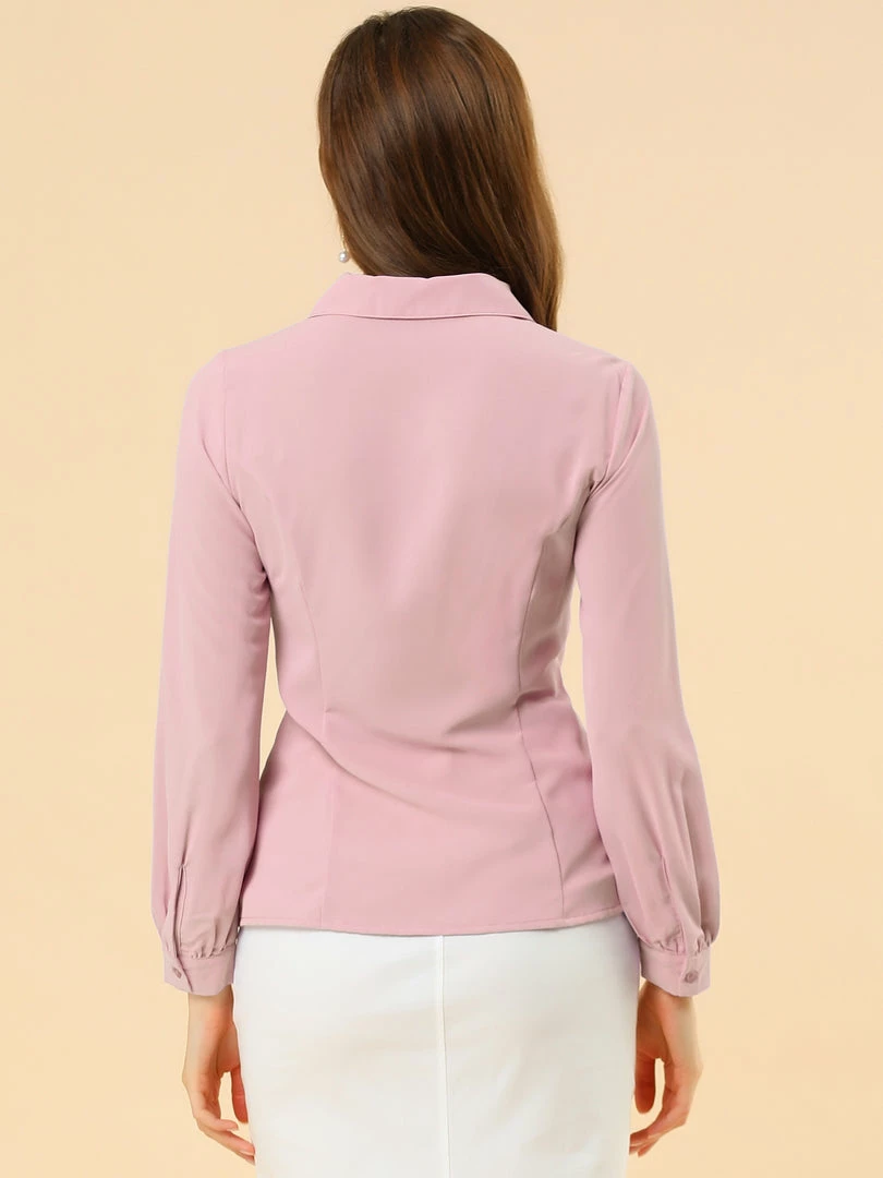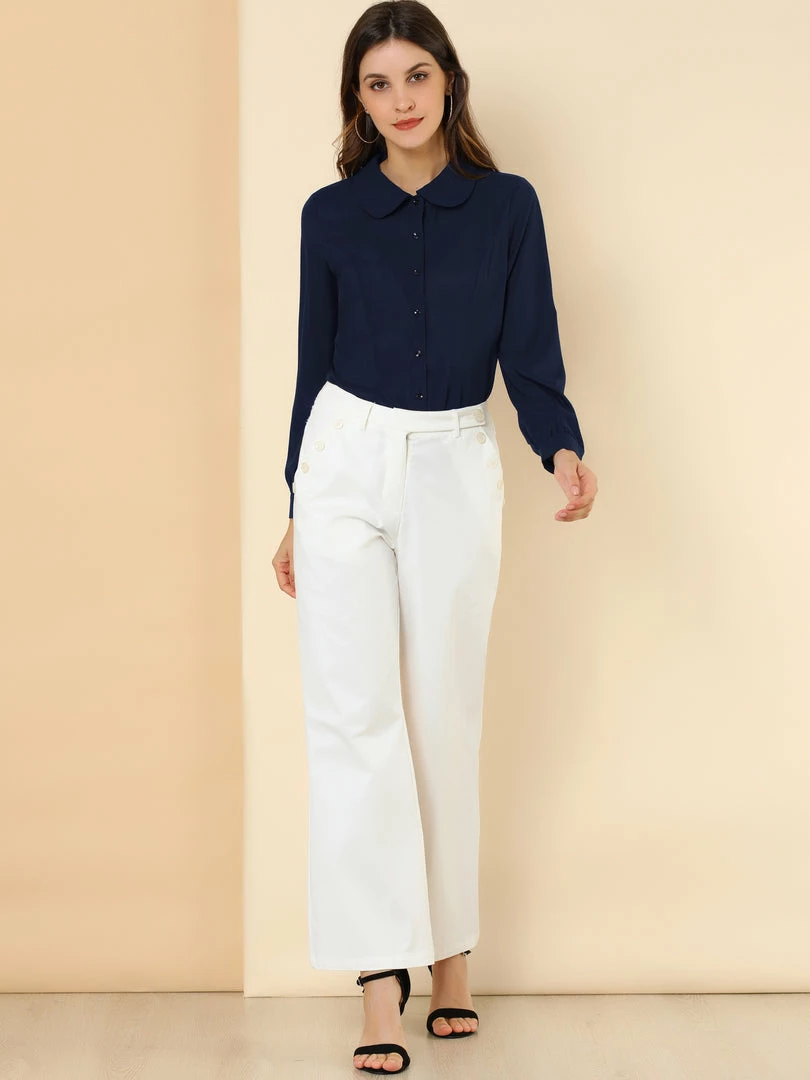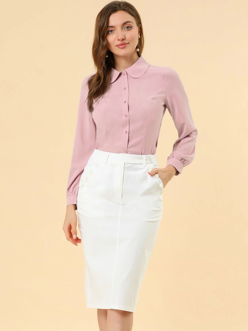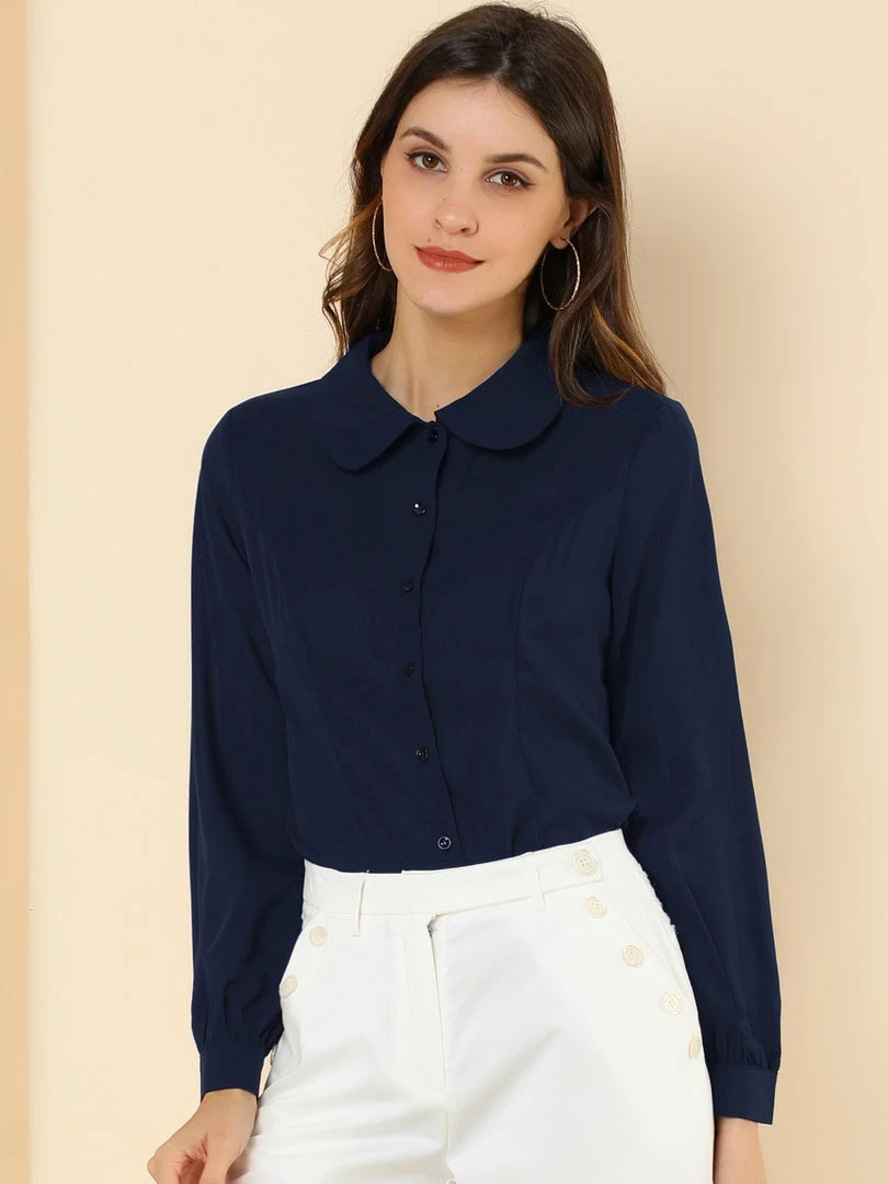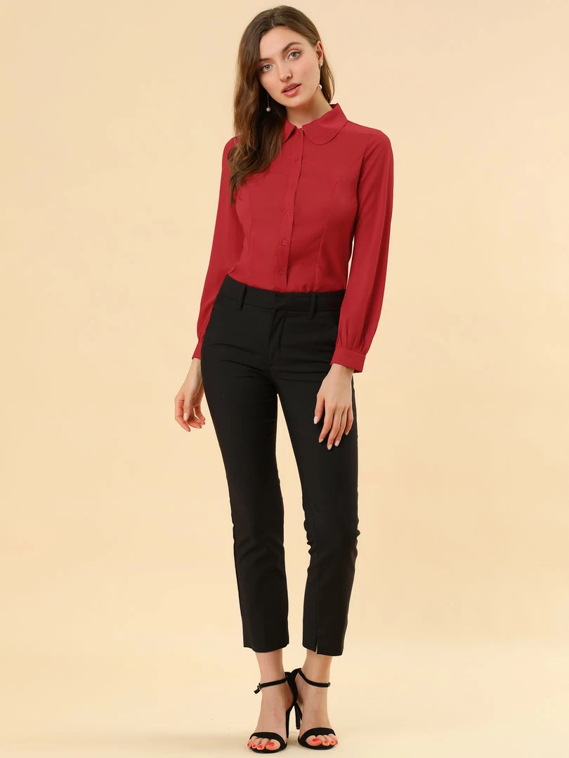 Allegra K Women’s Button Up Shirt Career Peter Pan Collar Long Bishop Sleeve Blouse