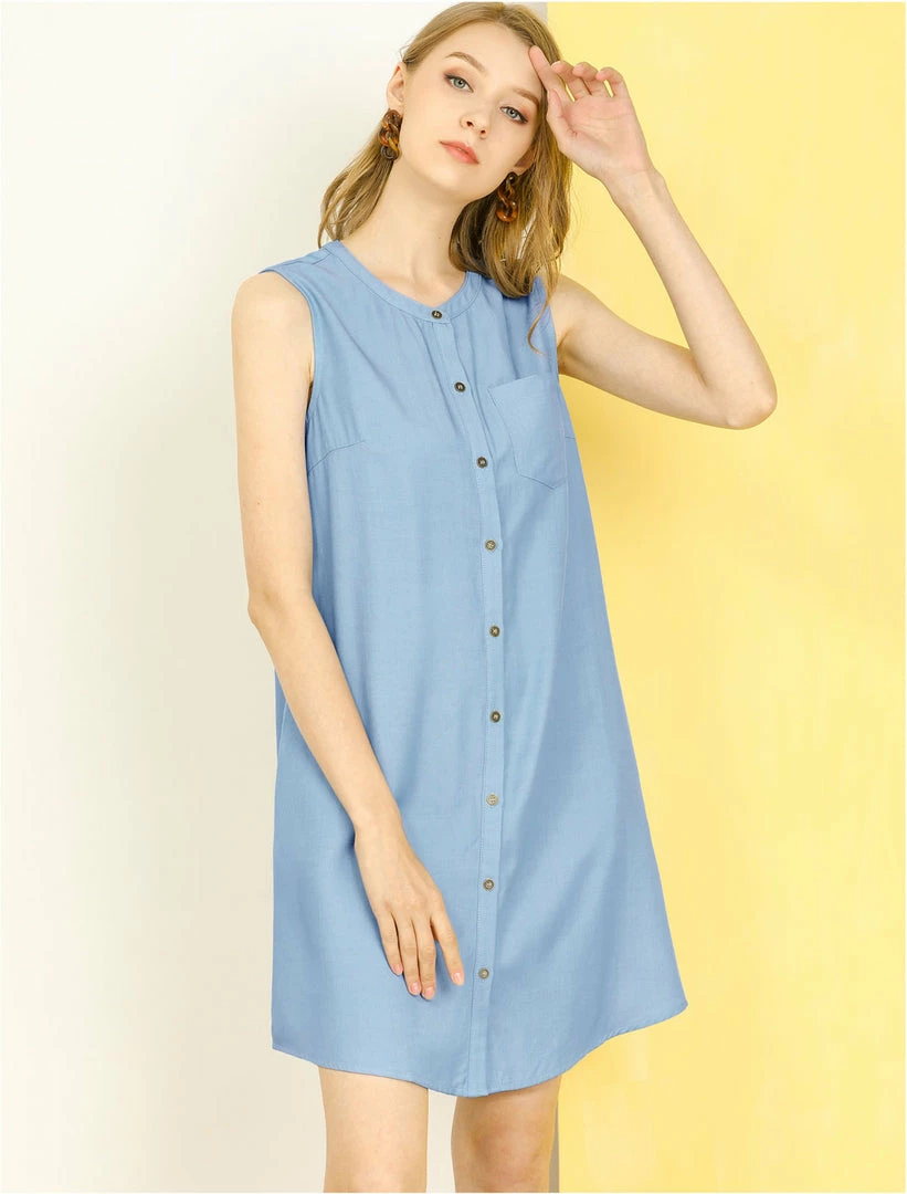 Allegra K Women’s Button Up Shirtdress Sleeveless Tunic Denim Chambray Dress With Pocket