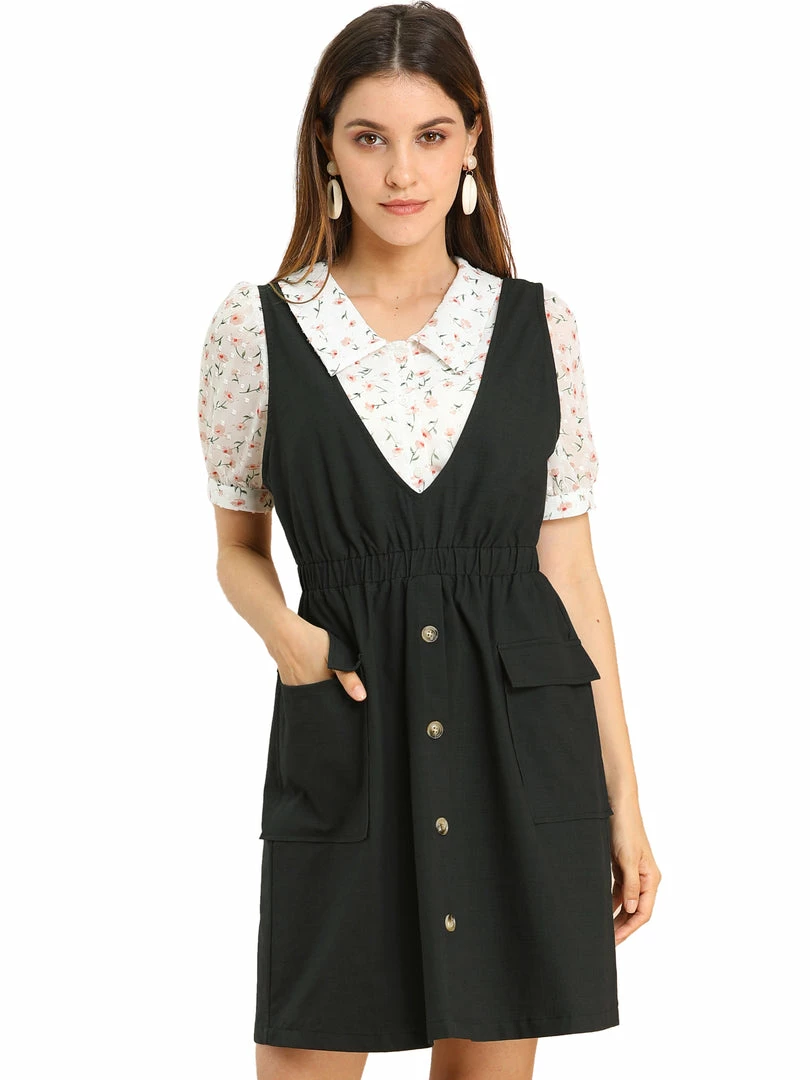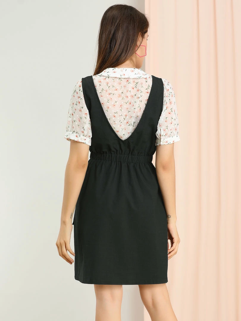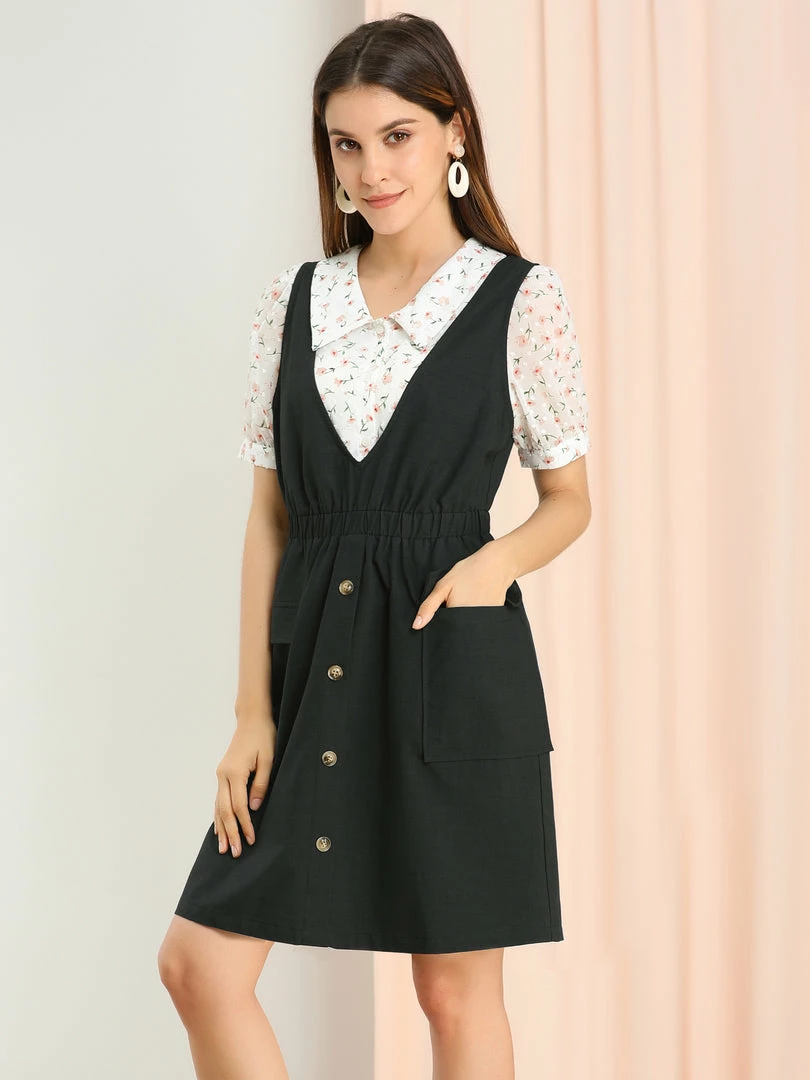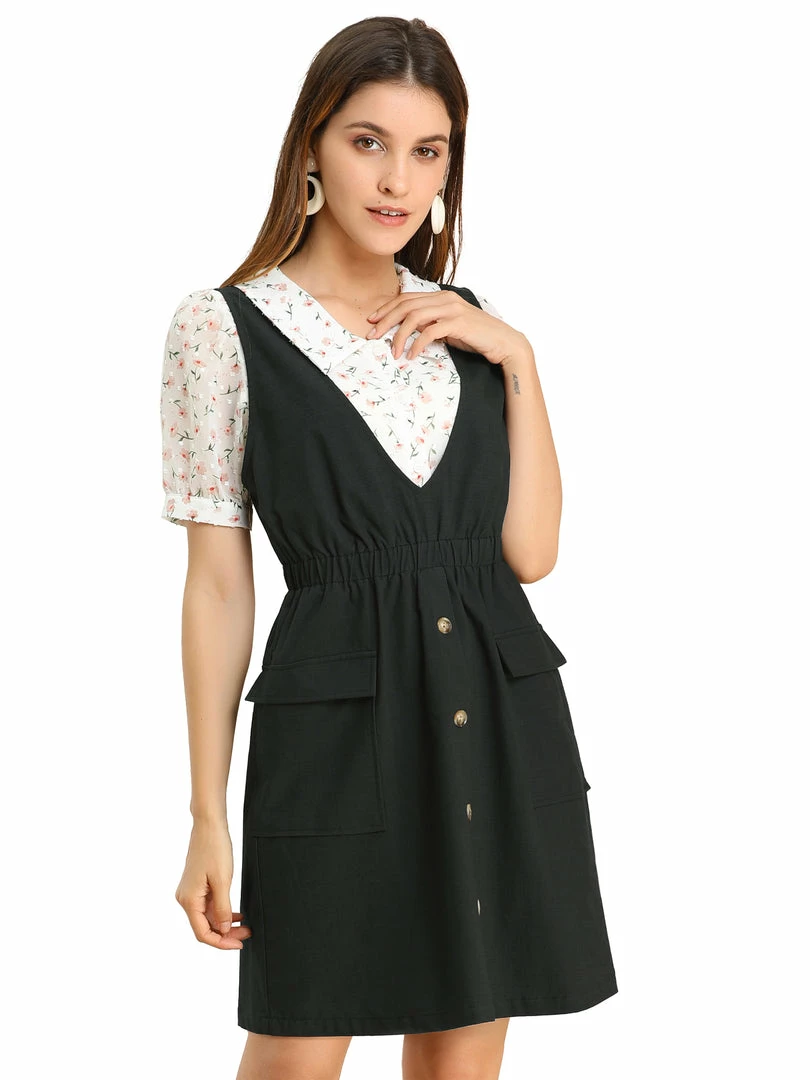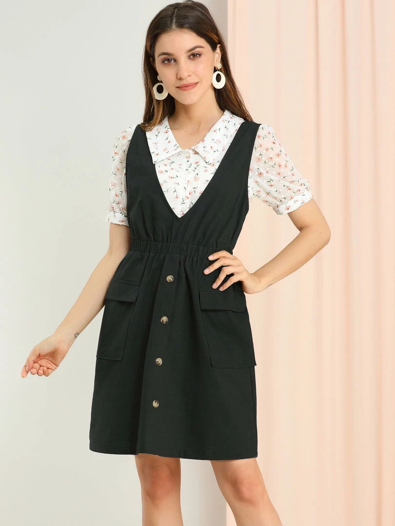 Allegra K Women’s Buttons Solid Overalls Pinafore Dress With Pockets