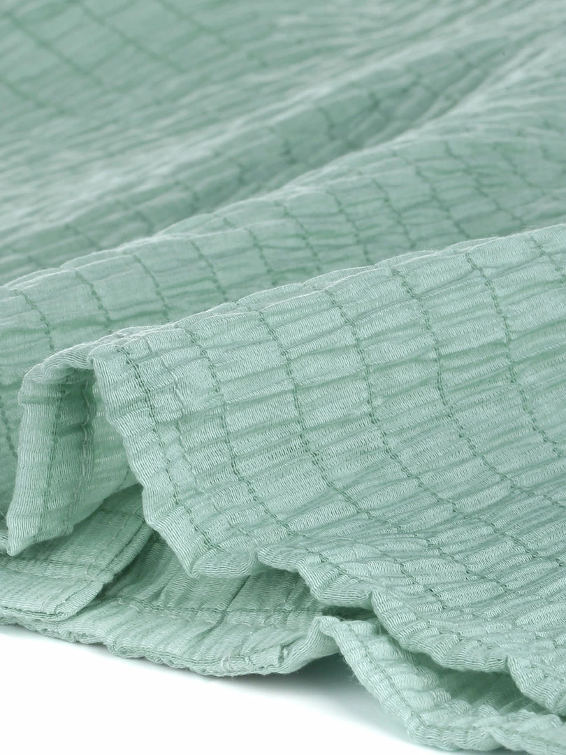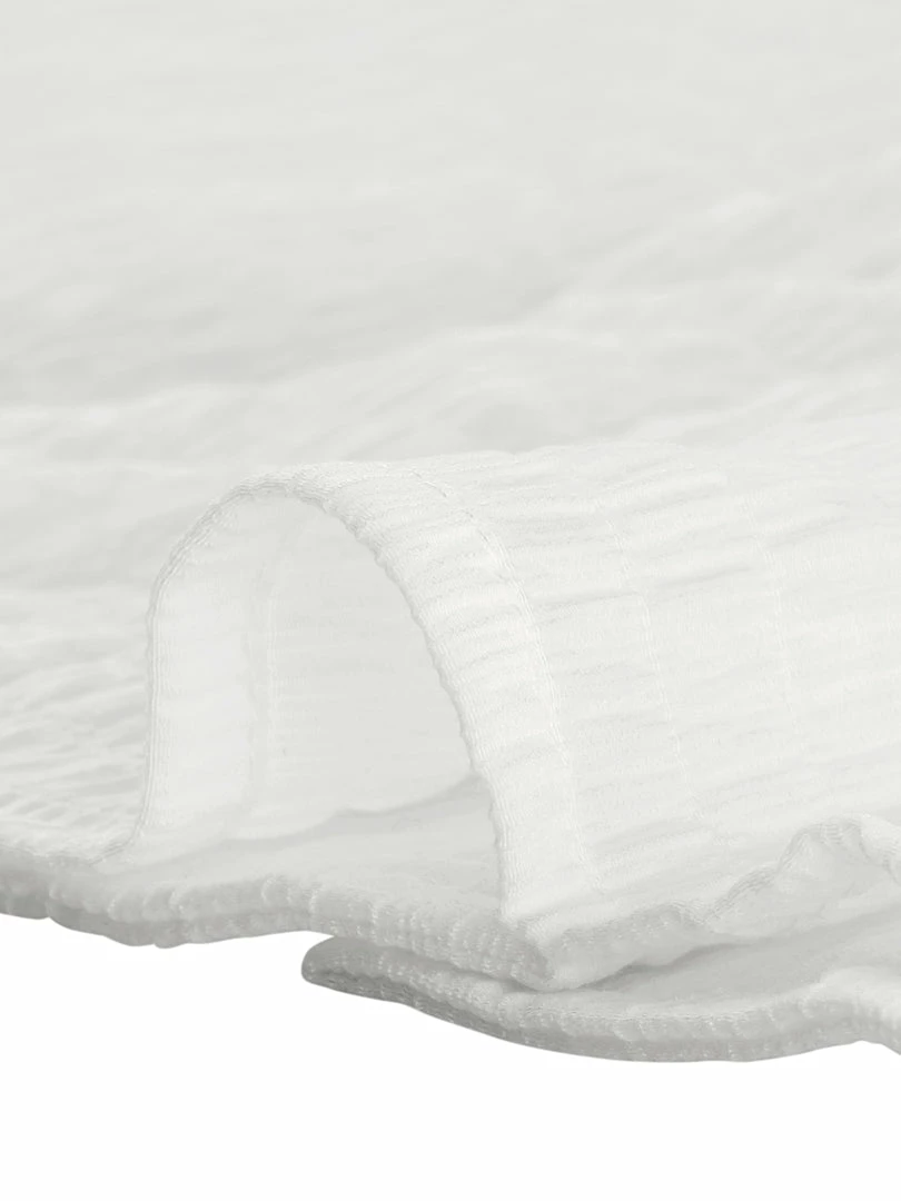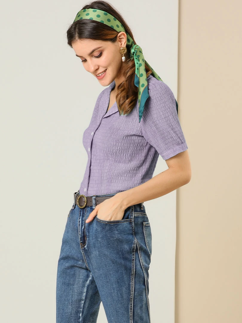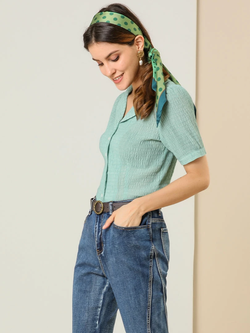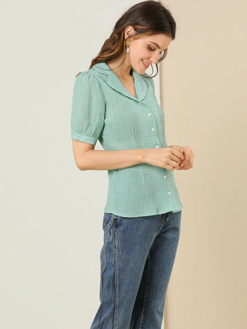 - Simple and cute, this shirt features camp collar, button front, textured fabric, short bubble sleeve, buttoned cuff, and solid color.