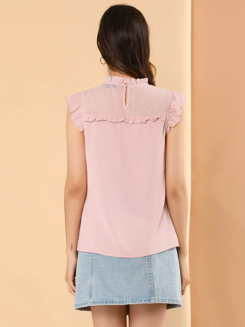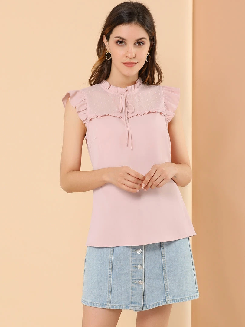 Allegra K Women’s Cap Sleeve Blouses Chiffon Ruffle Stand Collar Tie Summer Shirt Tops