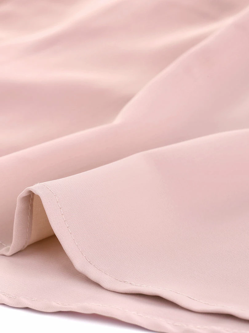• Lightweight and super versatile, this blush top of breathable polyester is simply detailed with a ruffled neckline and swingy bow tie