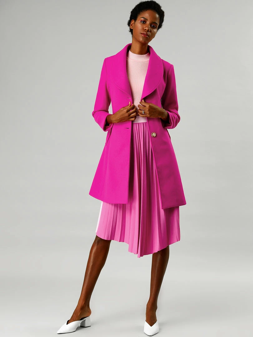 - Cut in a regular fit with a belted waist, it features side pockets and a collared neckline which combined with its long length, elongates the silhouette.Â