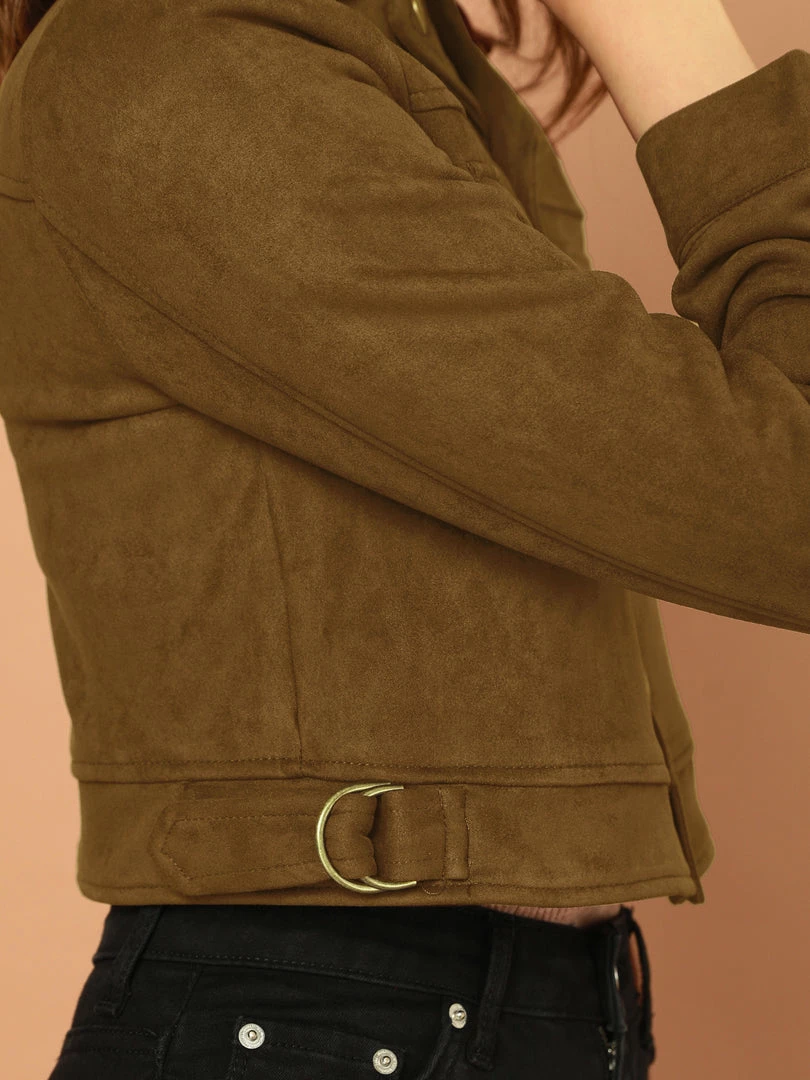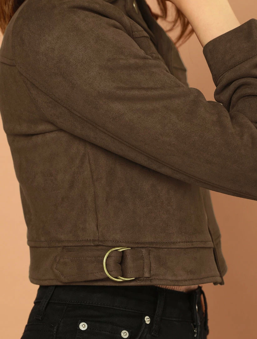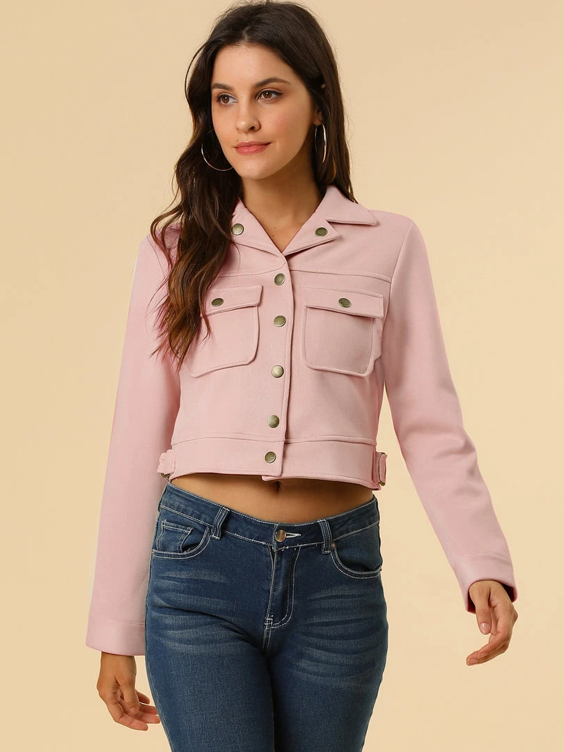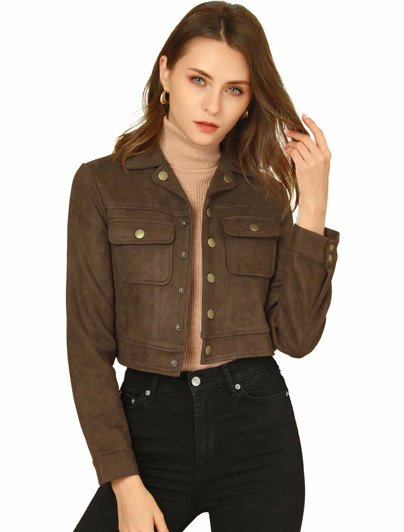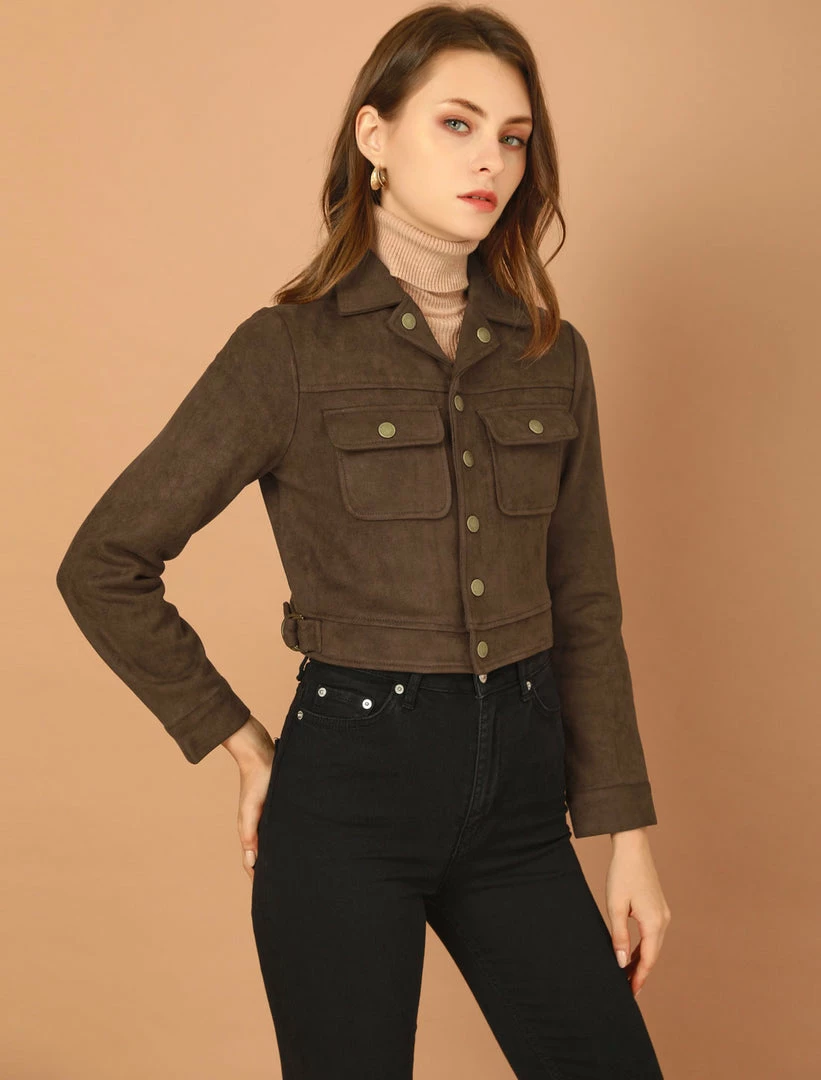 • Women’s Turn Down Collar Button Up Faux Suede Cropped Jacket