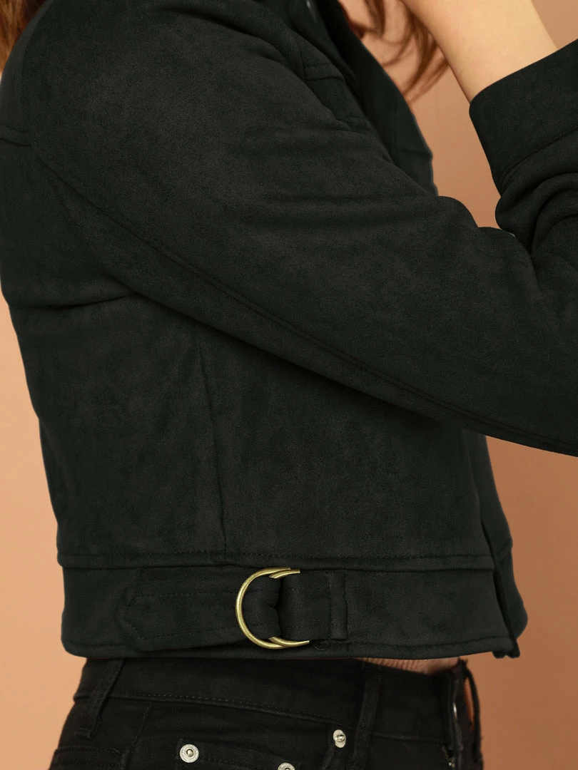 • Featuring turn down collar with single breasted design lend an elegant finishing touch and stylish feel on this Faux Suede Cropped Jacket.