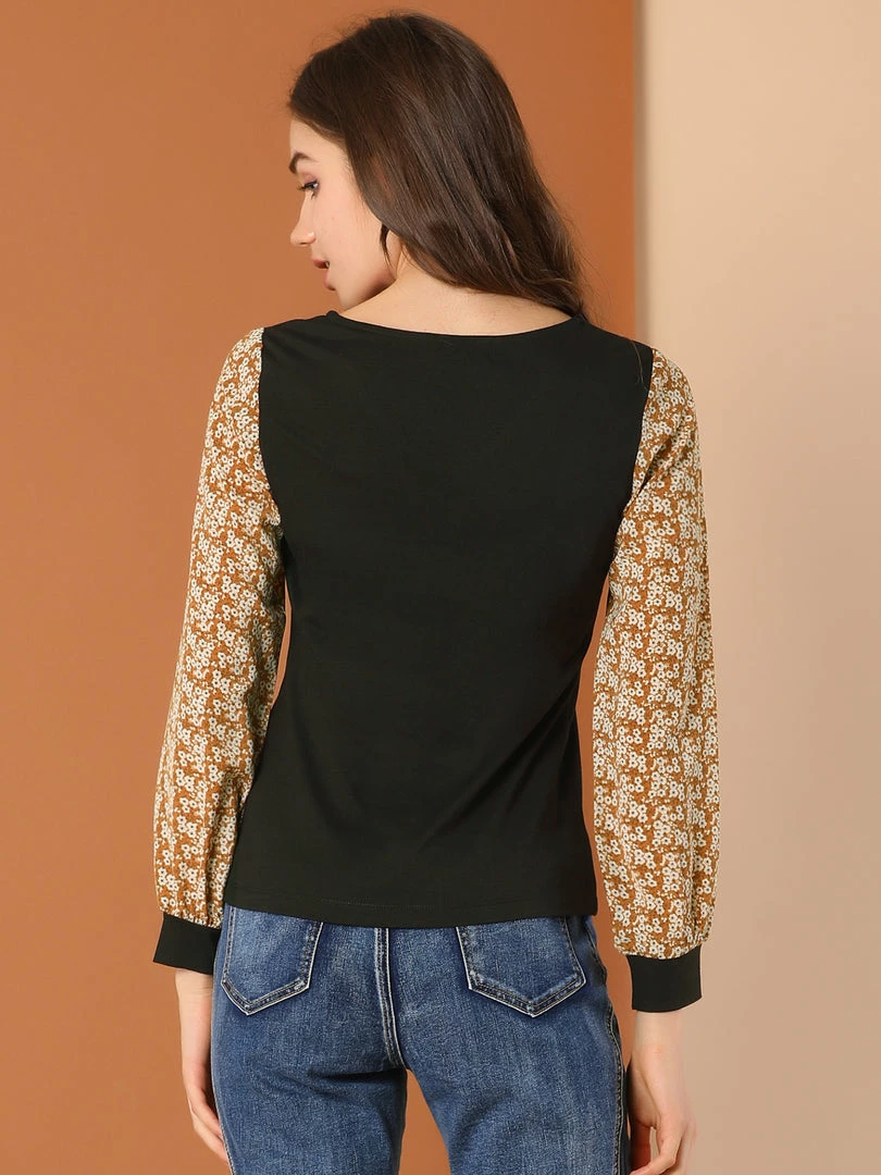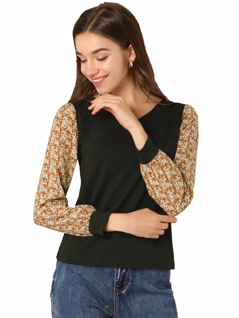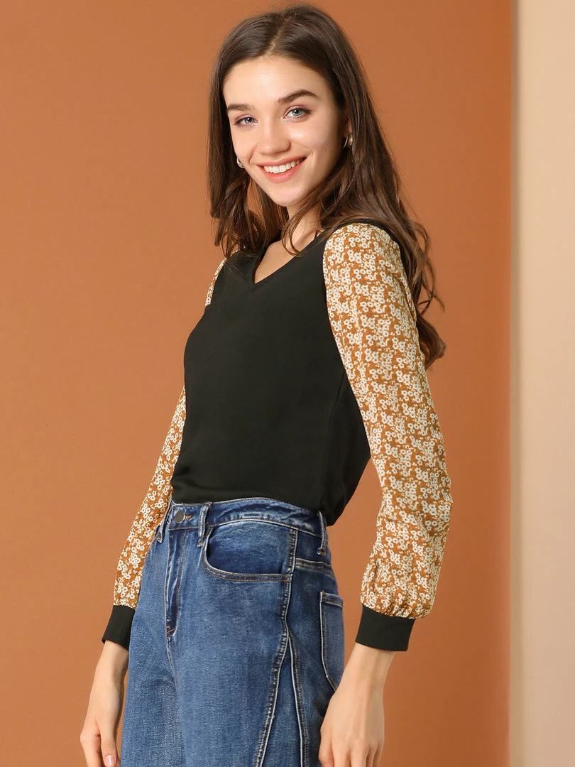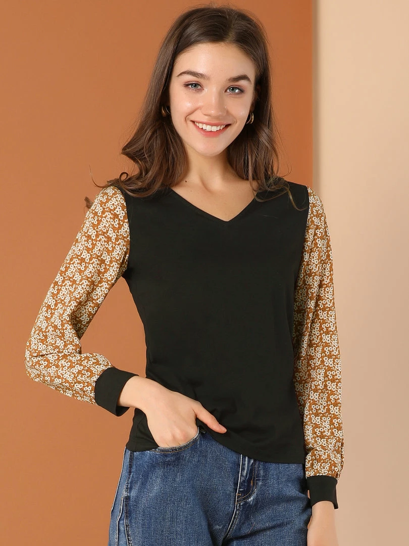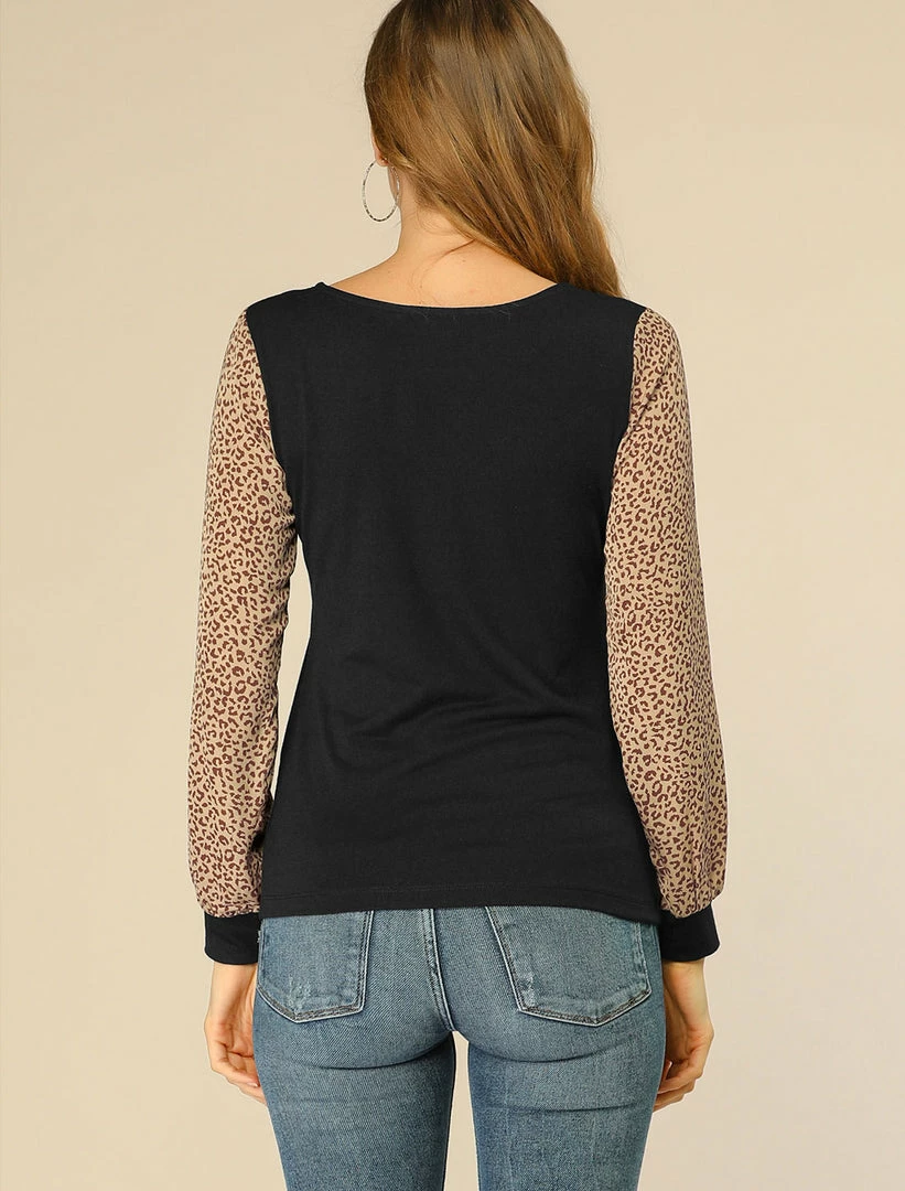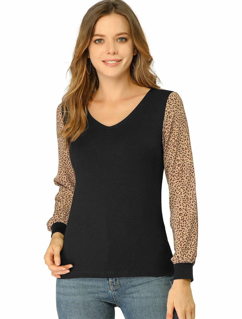 Allegra K Women’s Casual Leopard Print V Neck Patchwork Long Sleeve Tops T-Shirts