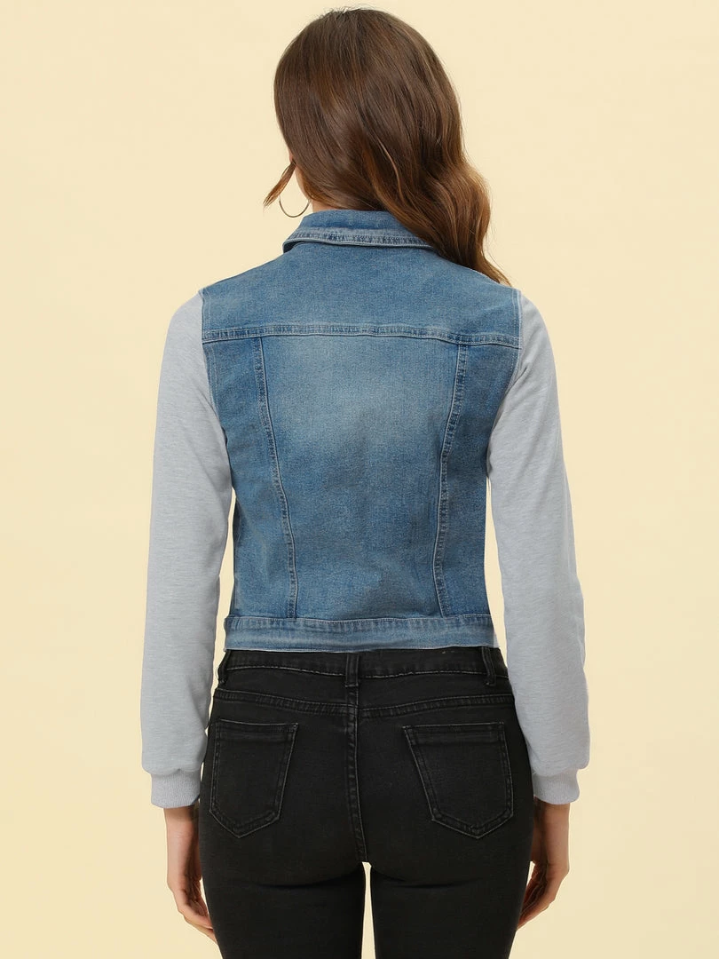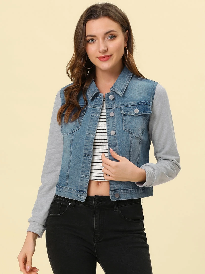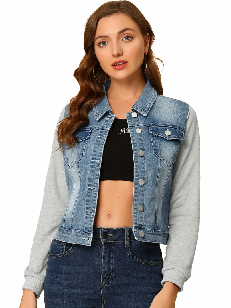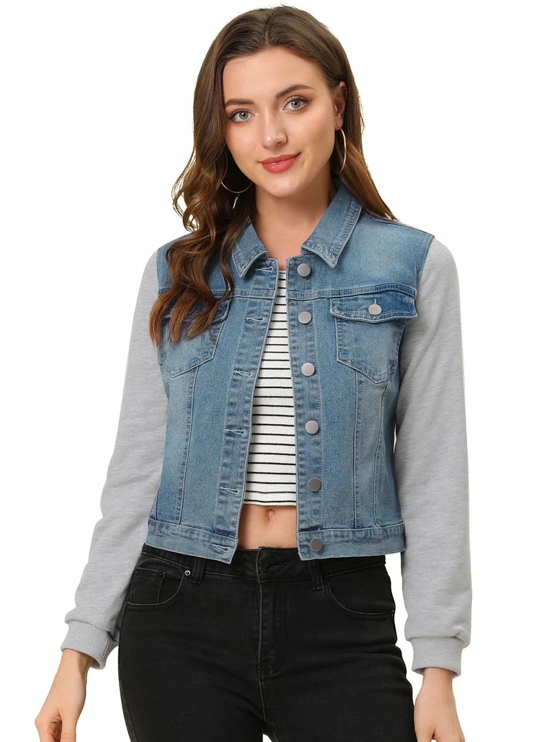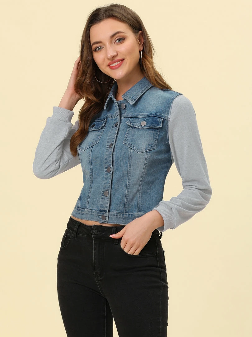 - Allegra K washed denim jacket, featuring a basic collar, button-down, two pockets, a paneled long sleeves.