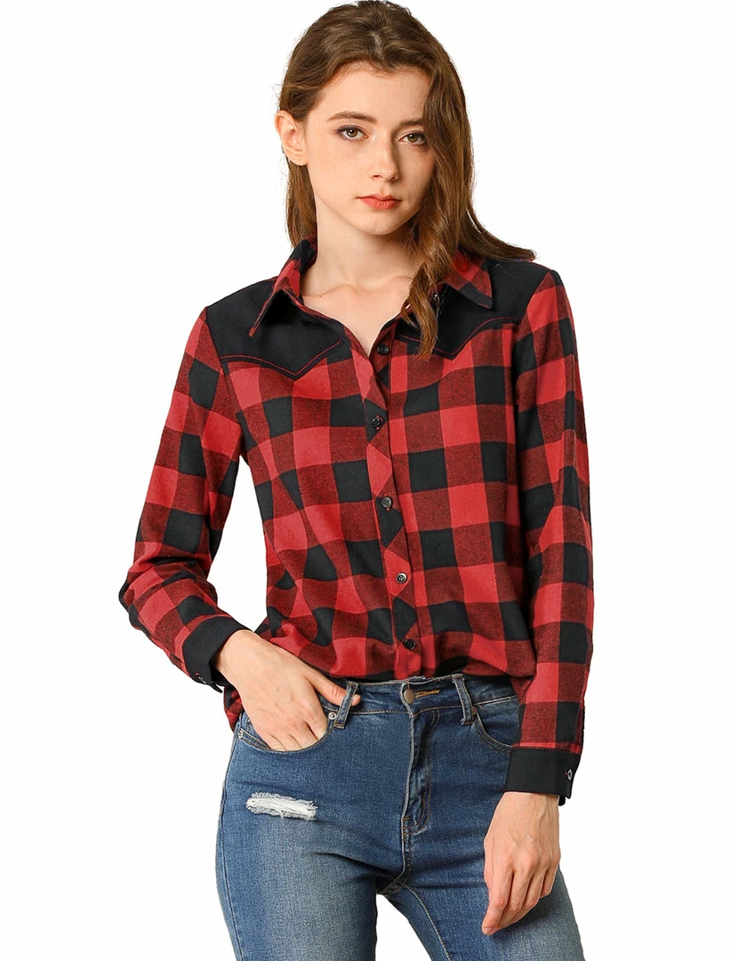Allegra K Women’s Casual Long Sleeve Collared Buffalo Check Blouse Button Down Plaid Shirt