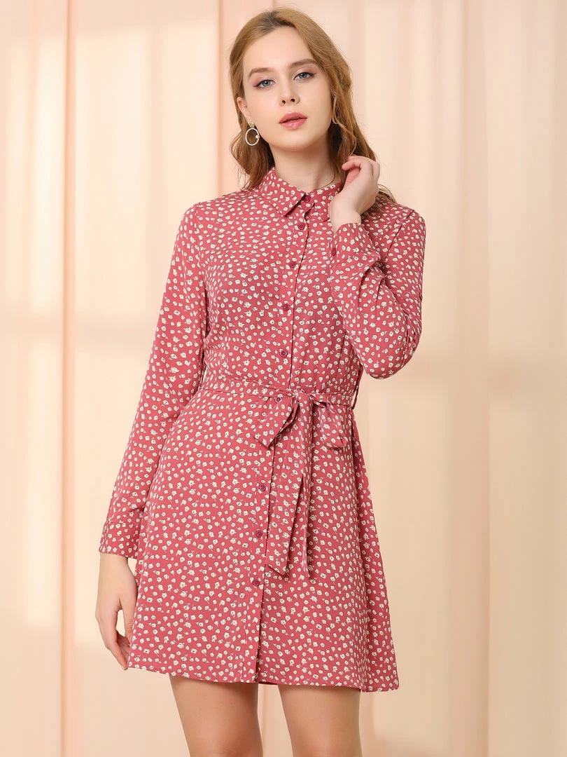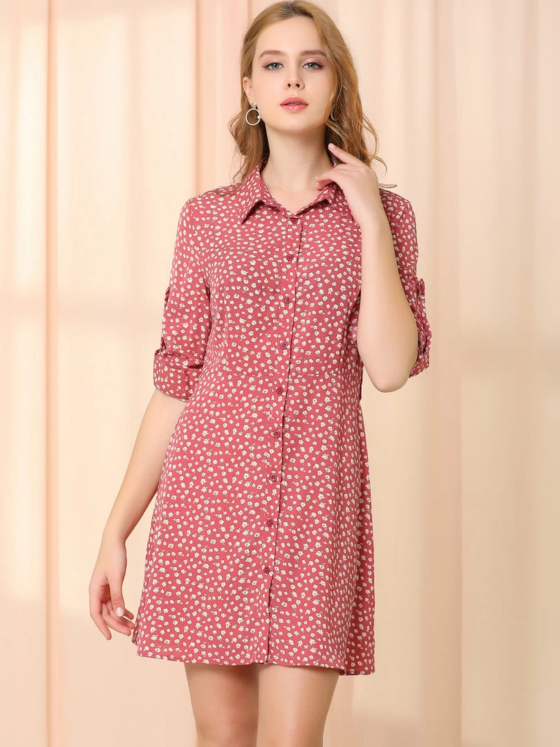 Allegra K Women’s Casual Point Collar Long Sleeve Ditsy Floral Full Placket Mini Shirt Dress