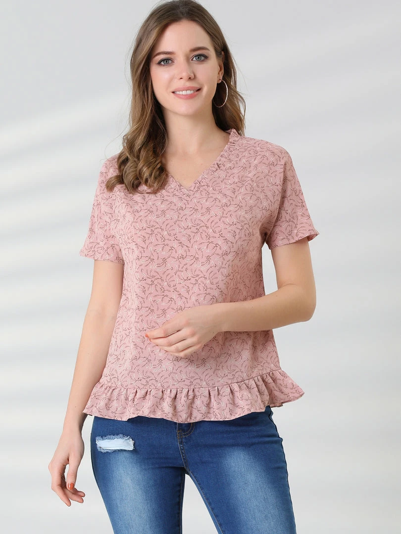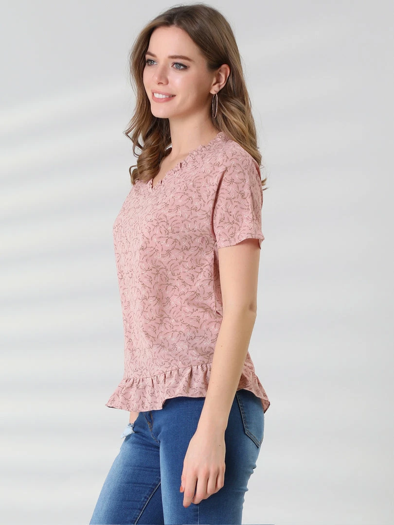 Allegra K Women’s Casual Ruffle V Neck Short Sleeve Floral Blouse
