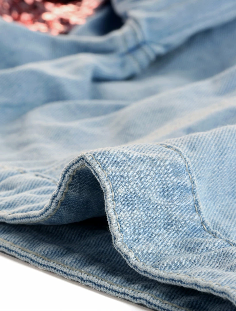 • Rose gold sequin brings shine to the front pockets bursting across this fashion denim jacket.