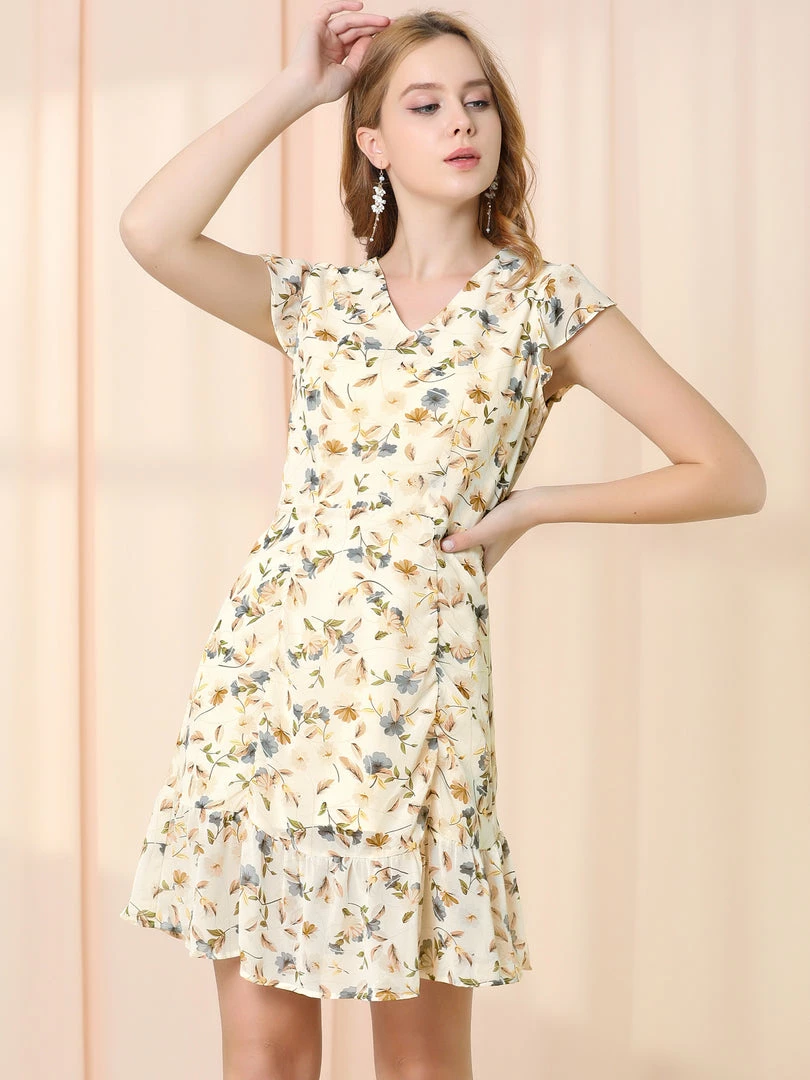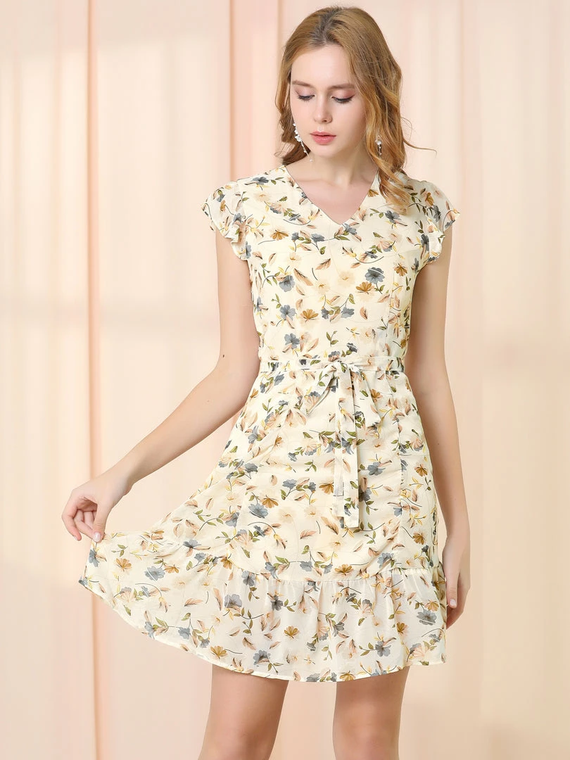 Allegra K Women’s Casual Short Sleeve Cute Tie V Neck A-Line Floral Dress