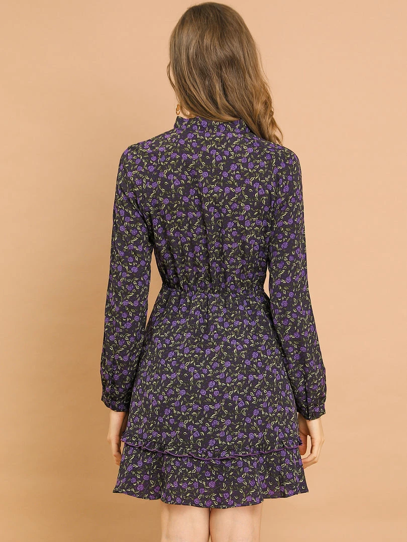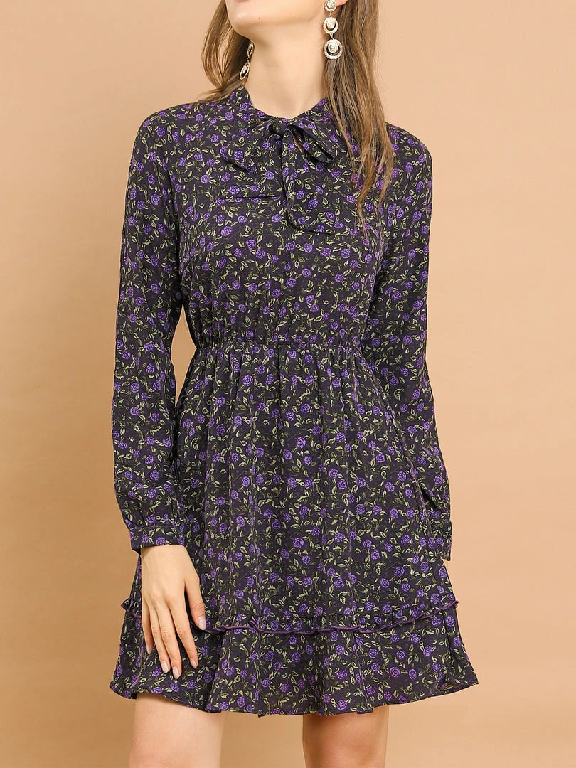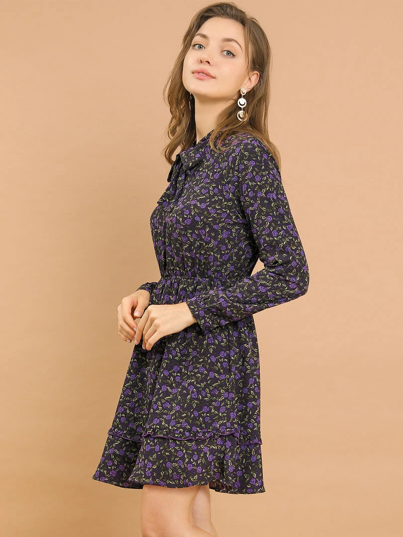 Allegra K Women’s Casual Tie Neck Long Sleeve Elastic Waist Ruffle Hem Floral Dress