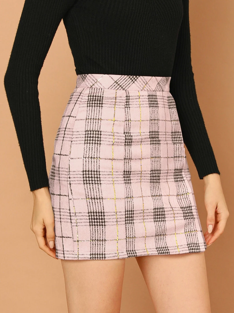 Allegra K Women’s Check Slit Hem Faux Suede Mini Skirt